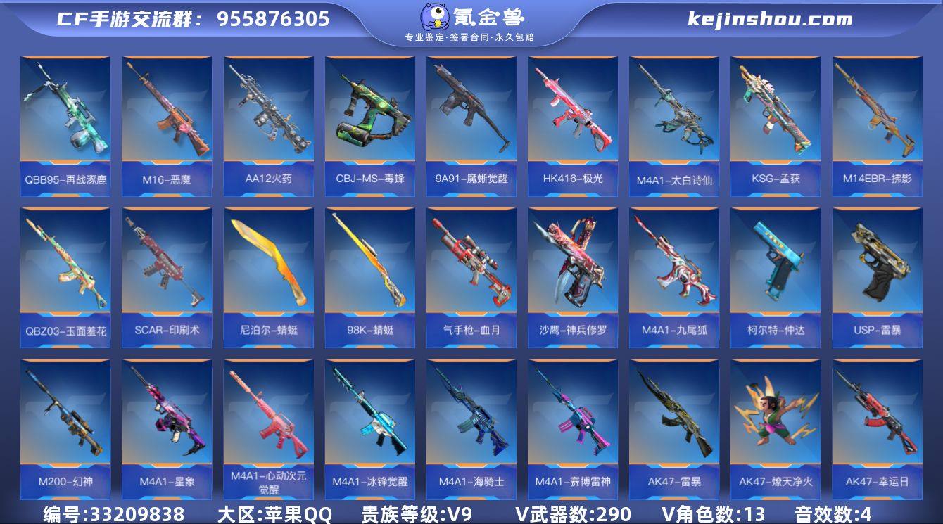 【账号近期有更新、也多了一些东西、具体上号验号为准】可二次- 苹果Q 可二次 V9 25王者含投掷 女团王影王戮+仲达过载+秒才过载+星象+幻神 九尾狐+王魄 王怒 王翼 王迹+4女团角色+COP『 290V-VIP9-显血戒』 【系统】苹果QQ 【游戏等级】160 【贵族等级】V9 【收藏点数】28052 【武器】王者之翼 王者之影-HeartShot 王者之魄-HeartShot 王者之戮-HeartShot 王者之怒-HeartShot 王者之心-HeartShot 王者之狱 王者之烈 王者之霆 王者之轮 王者之隐-冰霜奇迹 王者之业-冰霜奇迹 王者之迹 王者之魂-白金血钻 王者之灵-HeartShot 王者之击 王者之锋 王者之竞手雷 王者之竞闪光弹 王者之竞烟雾弹 王者之兽手雷 王者之兽闪光弹 王者之兽烟雾弹 王者之影闪光弹-HeartShot*2 王者之翼闪光弹-HeartShot 王者之心闪光弹-HeartShot 王者之势闪光弹-HeartShot 王者之影烟雾弹-HeartShot*2 王者之翼烟雾弹-HeartShot 王者之心烟雾弹-HeartShot 王者之势烟雾弹-HeartShot 王者之圣闪光弹 王者之圣烟雾弹 CZS2-仲康 KSG-孟获 M4A1-武圣 M4A1-星象 M4A1-仲达-过载 M4A1-九尾狐 AWM-妙才-过载 巴雷特-定军-一战扬威 M200-幻神 P90-双脊龙 81式-光明之神-千变 柯尔特-仲达 MK23-幻神 双管猎枪-黑骑...