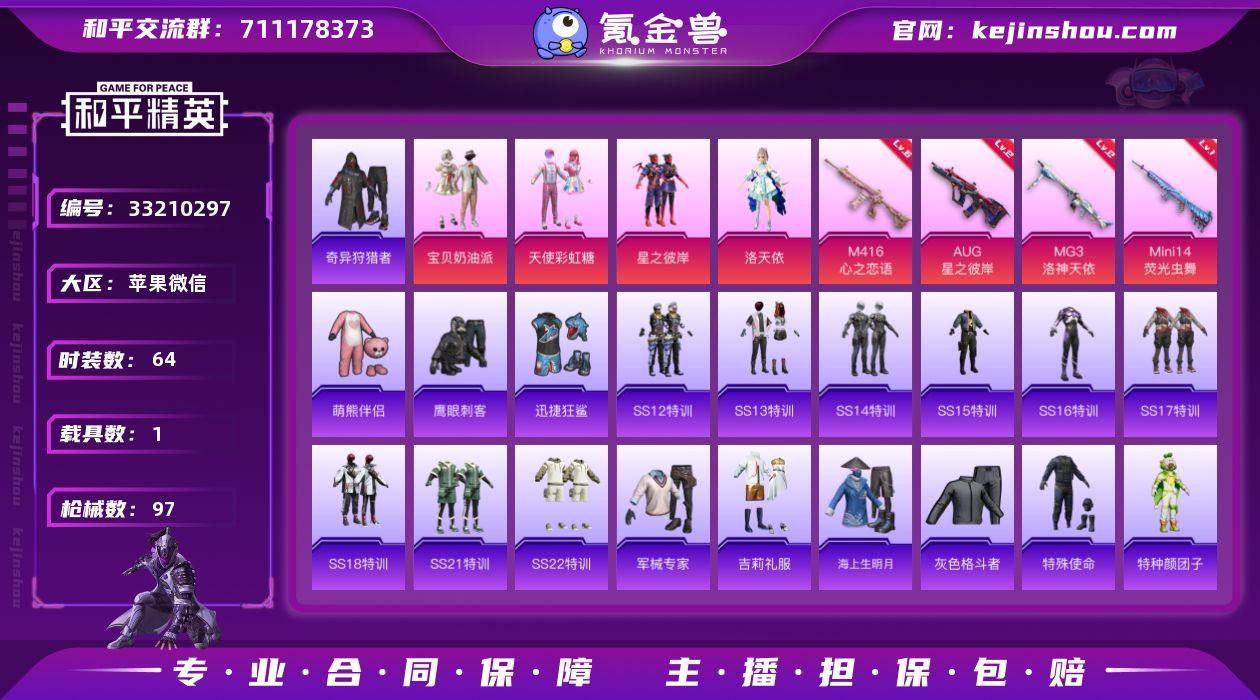 苹果微信 LWX397【暮色幽蹄马皮】【1神装4粉装8特效枪1载具3粉色飞行器 二级艾丽娅 奇异狩猎者/萌熊伴侣/奶油派/彩虹糖/星之彼岸/洛天依/唐三】36017热力值-8王牌印记-64套装-97枪皮 【红色神装等级】:暮色玫影-艾丽娅(二级) 【红色角色神装】:暮色玫影-艾丽娅 【热门品类】:套装-奇异狩猎者,套装-萌熊伴侣 【粉色套装】:粉装-宝贝奶油派,粉装-天使彩虹糖,粉装-星之彼岸,角色-洛天依 【粉色枪皮等级】:AKM-暮色玫影(三级),M416-心之恋语(六级),M416-天马神君(三级