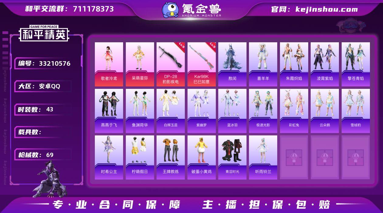 不可二次 安卓 手Q-3粉装-3特效枪-0载具-0粉色飞行器-18478热力值-2王牌印记-43套装-69枪皮 QW264620 【粉色套装】:角色-歌者泠鸢,角色-呆萌星弥,角色-罪夜之冕 【粉色枪皮等级】:Kar98K-巳巳如意(五级),Mk14-福马献瑞(一级),DP-28-豹影疾电(五级) 【粉色枪皮】:Kar98K-巳巳如意,Mk14-福马献瑞,DP-28-豹影疾电 【粉色降落伞】:第五大道降落伞,桃粉嫣然降落伞,喜羊羊与灰太狼降落伞,炫彩糖果降落伞 【稀有套装】:套装-燕燕于飞,套装-鱼渊荷华,套装-白辉玉蕊,套装-紫幽梦,套装-蓝冰羽,套装-极速光影,套装-彩虹兔,套装-云朵鹅,套装-雪绒豹,角色-时希公主,套装-朱霞炽焰,套装-凌霄紫焰,套装-擎苍青焰,玩偶服-喜羊羊,角色-敖闰,角色-幽雨猫猫 【稀有枪皮】:SCAR-L-玉兔迎春,M762-云朵鹅,G36C-星穹咏叹调,蜜獾-天降萌叽,蜜獾-绯穹魔姬,ARX-凌霄紫焰,UZI-天降萌叽,汤姆逊-天降萌叽,JS9-凌霄紫焰,SKS-炫彩节奏,AMR-镜光幻境,AMR-喜羊羊与灰太狼,SVD-云朵鹅,S1897-荧海星豚,DBS-彩虹符号,DBS-第五大道,DBS-幻彩电音,SPAS-12-云朵鹅,DP-28-彩虹符号,MG3-幻世战舞者,MG-36-凌霄紫焰,P92-凌霄紫焰,蝎式手枪-虹云熊熊,沙漠之鹰-云朵...