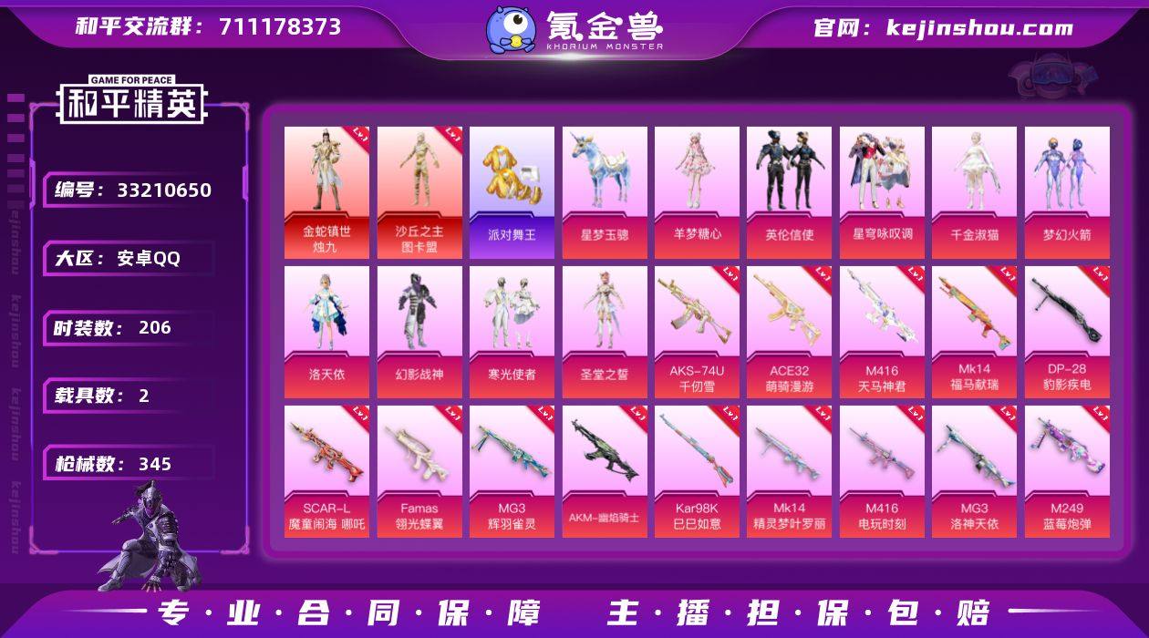 【2红装4级图卡盟金鞋18特效枪9粉装2载具 秒换绑不用等】 安卓Q区-110399热力值-206套装-345枪皮 【2红装】 沙丘之主-图卡盟(4级) 金蛇镇世-烛九(1级)【2载具】 玛莎拉蒂Ghibli(粉) 星梦玉骢【2稀有】 派对舞王(金靴子) Mark.06蓝螳螂【9粉装】 梦幻火箭 洛天依 圣堂之誓 寒光使者 幻影战神 星穹咏叹调 角色-羊梦糖心 英伦信使 角色-千金淑猫【18特效枪】 AUG-甜心首席(3级) AKM-幽焰骑士(3级) MG3-辉羽雀灵(3级) Mk14-福马献瑞(1级) ACE32-萌骑漫游(4级) M416-天马神君(3级) 破片手榴弹-贪吃小熊(4级) 燃烧瓶-天降桃花(2级) AKS-74U-千仞雪(5级) SCAR-L-纯梦嫁纱(7级) MG3-洛神天依(5级) M249-蓝莓炮弹(7级) Mk14-精灵梦叶罗丽(6级) Kar98K-巳巳如意(5级) Famas-翎光蝶翼(4级) M416-电玩时刻(5级) DP-28-豹影疾电(5级) SCAR-L-魔童闹海 哪吒(3级)【316热门】 迅捷狂鲨 冰公主 SS27特训 SS26特训 SS25特训 SS24特训 SS23特训 SS22特训 Mk47-洛神天依 Mini14-梦幻火箭 Kar98K-王子的夏天 AWM-不夜海上花 AKM-缤纷海域 SCAR-L-玉兔迎春 GROZA-田园牧歌 M762-天降萌叽 M762-彩虹符号 Mk47-乌木金纹 SKS-糯团青竹 UZI-娇憨猪猪 M416-夜灯 DBS-彩虹符号 M249-彩虹符号 MG3-幻世战...