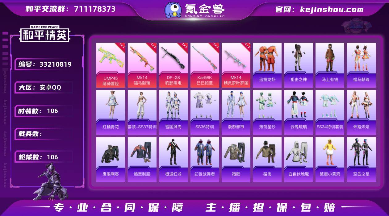 【5特效枪特价号 秒换绑不用等】 安卓Q区-29644热力值-106套装-106枪皮 【5特效枪】 Mk14-福马献瑞(5级) UMP45-萌骑冒险(1级) Mk14-精灵梦叶罗丽(7级) Kar98K-巳巳如意(5级) DP-28-豹影疾电(3级)【110热门】 极速红龙 白色伏地魔 SS27特训 SS26特训 SS25特训 SS24特训 SS23特训 SS22特训 SCAR-L-玉兔迎春 GROZA-田园牧歌 M762-天降萌叽 Mk47-乌木金纹 SKS-糯团青竹 UMP45-蓝色火焰 DBS-彩虹符号 M249-彩虹符号 MG3-幻世战舞者 鹰眼刺客 GROZA-彩虹符号 破蛋小黄鸡 长空猛禽 特训学院 燃烧卡路里 青年教官 牛气冲天 魅力单车 六六大吉 猎鹰 蓝色运动 橘黑制服 竞技达人朋克 黄色运动 漫步者 黄色伏地魔 红色运动 黑色伏地魔 海岛探路者 春日漫步 AA12-G-雨过天青 沙漠之鹰-雨过天青 P90-紫矿核心 M16A4-雨过天青 顶瓜瓜 雨过天青 冰河战士 MG-36-薄荷星砂 GROZA-福马献瑞 SS34特训 漫游都市 朱霞炽焰 AWM-天降萌叽 福马献瑞 大橘大利 SS20特训 SS21特训 SS29特训 ACE32-冰晶雪宝 SS28特训 海盐绵绵冰 M16A4-冰河战士 巳巳如意 SS36特训 大砍刀-像素花束 MG3-火熔核心 老实芭蕉 智谋强哥 战术大师 JS9-凌霄紫焰 MG-36-凌霄紫焰 蜜獾-启元战纹 迅捷龙虾 马上有钱 ARX-凌霄紫焰 P9...