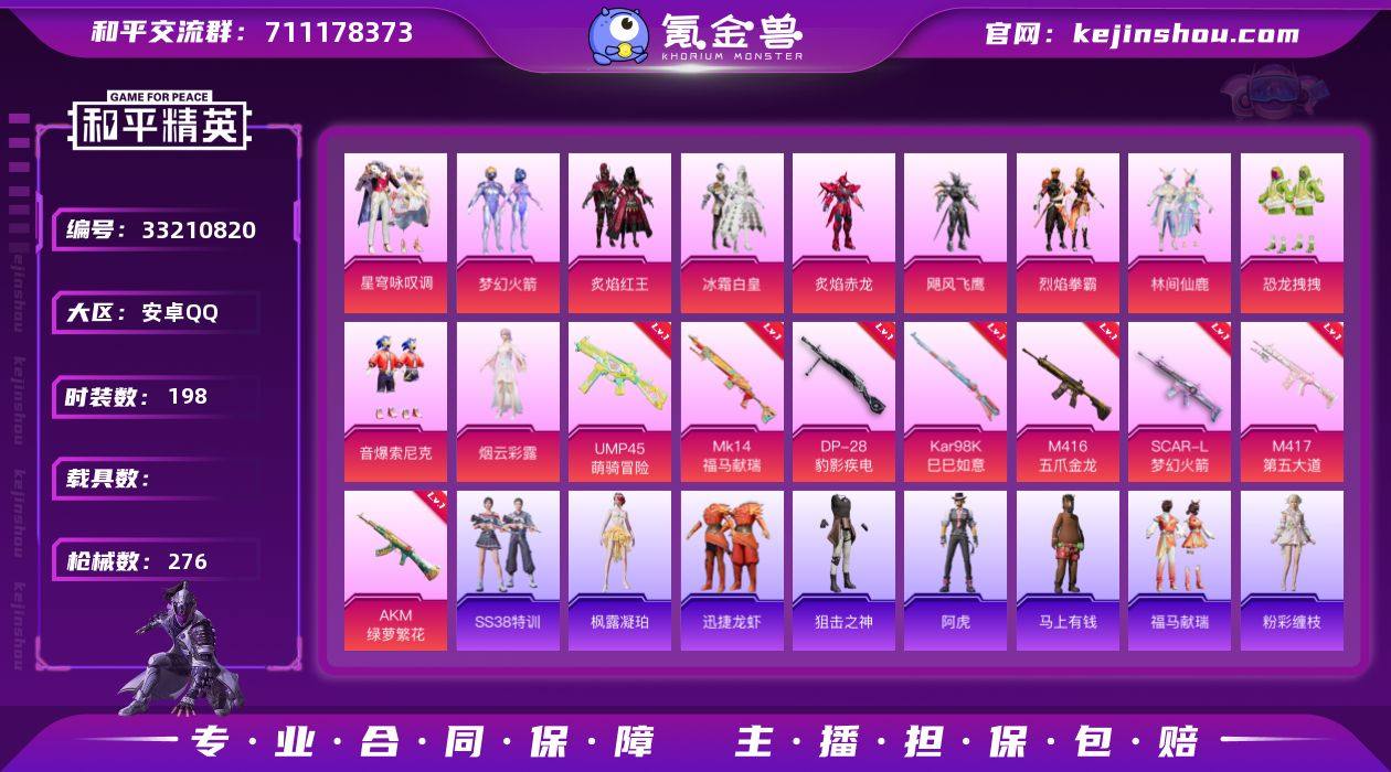 【红眼罩M4满级五爪金龙11粉装8特效枪猫包梦幻火箭 秒换绑不用等】 安卓Q区-82485热力值-198套装-276枪皮 【3稀有】 百万伏待背包(猫包) 红眼罩 Mark.06蓝螳螂【11粉装】 林间仙鹿 梦幻火箭 冰霜白皇 恐龙拽拽 炙焰红王 烈焰拳霸 炙焰赤龙 飓风飞鹰 音爆索尼克 角色-烟云彩露 星穹咏叹调【8特效枪】 M416-五爪金龙(7级) Mk14-福马献瑞(5级) UMP45-萌骑冒险(4级) SCAR-L-梦幻火箭(7级) M417-第五大道(7级) AKM-绿萝繁花(5级) Kar98K-巳巳如意(5级) DP-28-豹影疾电(5级)【231热门】 暗影哥特(红眼罩) 赛罗奥特曼 浪漫天命 雪山精英(老6服) 激萌罗小黑 英勇保护者 裁决冥王 极速红龙 团圆交子 瑞龙福将 狂沙舞者 白色伏地魔 SS27特训 SS25特训 SS24特训 SS23特训 SS22特训 Mk47-洛神天依 Mk14-暗星紫秘 Mini14-梦幻火箭 M24-百合蜜语 Kar98K-红伞翩翩 SCAR-L-玉兔迎春 GROZA-田园牧歌 M762-天降萌叽 Mk47-乌木金纹 SKS-糯团青竹 UZI-娇憨猪猪 M416-夜灯 UMP45-蓝色火焰 S12K-垂柳戏鸭 DBS-彩虹符号 MG3-幻世战舞者 AKM-虎虎生威 AKM-霓虹街区 AKM-星之彼岸 M416-紫翼圣骑 呆萌铁蟹 鹰眼刺客 GROZA-异彩先驱 GROZA-蓝莓炮弹 AUG-灵符少年 长空猛禽 异彩先驱 虚音幻奏 甜心亚梦...