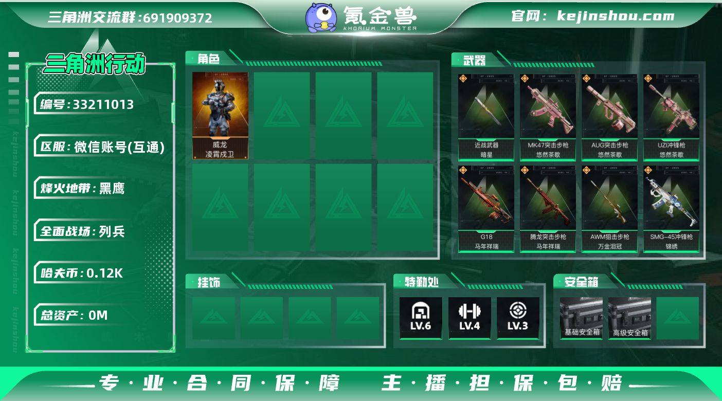 实名: 不可修改 烽火地带段位: 黑鹰 全面战场段位: 列兵 总资产: 7 哈夫币: 124 干员外观: 威龙-凌霄戍卫 传说武器皮肤: SCAR-H战斗步枪-启航,近战-暗星,MK47突击步枪-暗星,SR-3M紧凑突击步枪-暗星,M14射手步枪-蛮荒,QBZ95-1突击步枪-凌霄戍卫,腾龙突击步枪-马年祥瑞,G18-马年祥瑞,AWM狙击步枪-万金泪冠,.357左轮-缄花,SR-25射手步枪-缄花,M14射手步枪-缄花,SMG-45冲锋枪-锦绣,K437突击步枪-锦绣,AKM突击步枪-锦绣,MK47突击步枪-悠然茶歇,AUG突击步枪-悠然茶歇,UZI冲锋枪-悠然茶歇