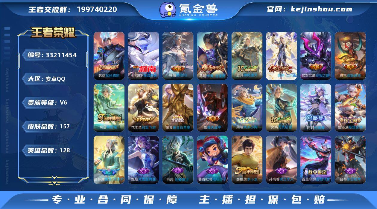 安卓Q-V6-永恒钻石I段位-127英雄-157皮肤-1典藏皮肤-1珍品传说-10传说-33史诗 【荣耀典藏】:韩信弑枪猎影 【珍品传说】:马可波罗怪盗基德 【传说皮肤】:韩信踏浪归,马超神骥逐星野,后羿神树通天,司空震愿照山河定,桑启鸣野蒿,典韦战鼓燎原,铠绛天战甲,张良黄金白羊座,花木兰冠军飞将,宫本武藏地狱之眼 【限定皮肤】:大乔绒语心约,杨戬破阵退雄兵,狄仁杰阴阳师,赵云皇家上将,高渐离玩趣恶龙,狄仁杰魔术师,达摩沙漠行僧,项羽海滩派对,苏烈千军破阵,裴擒虎李小龙,裴擒虎擒涛扼浪,云中君纤云弄巧,鲁班大师探海日志,桑启海盐诗旅,阿古朵江河有灵,张良古海寻踪,蒙犽百解令,鬼谷子天穹祈灯,姬小满妄想食味,沈梦溪龙舞盛年,刘邦剑破天穹,程咬金群星魔术团,刘备异域游侠,周瑜熔金海岸 【年限皮肤】:司空震愿照山河定 【赛季限定】:苏烈千军破阵,达摩沙漠行僧,桑启海盐诗旅,裴擒虎擒涛扼浪,鲁班大师探海日志,张良古海寻踪,鬼谷子天穹祈灯,刘邦剑破天穹,东皇太一噬灭天穹,太乙真人谧流熔炉,钟馗虚灵犬护,亚瑟荣光之誓,牛魔星界战将 【战令限定】:百里守约百相守梦,老夫子百相守梦,孙膑茶境仙,马超访茗客,周瑜线条小狗 【史诗皮肤...