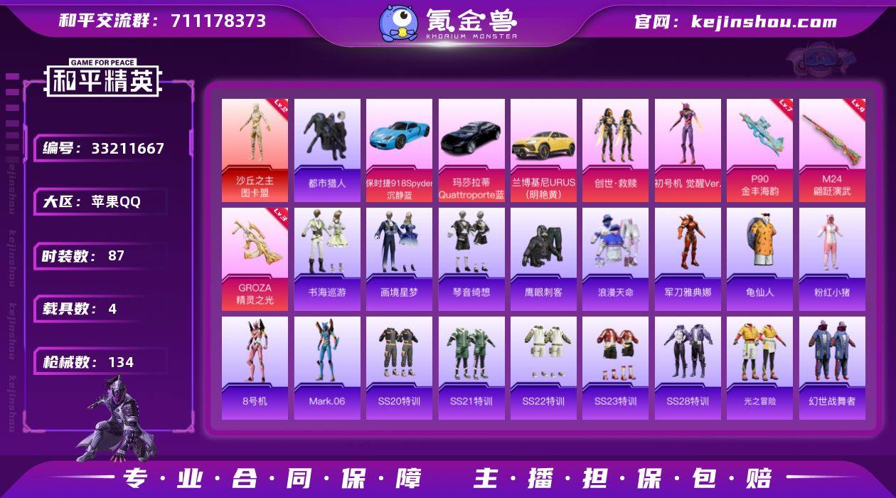 苹果 手Q-1神装-2粉装-6特效枪-4载具-7粉色飞行器-47350热力值-4王牌印记-87套装-134枪皮 【红色神装等级】:沙丘之主-图卡盟(二级) 【红色角色神装】:沙丘之主-图卡盟 【热门品类】:套装-浪漫天命,套装-都市猎人,角色-军刀雅典娜,套装-AG战队服,套装-龟仙人,套装-粉红小猪,角色-8号机,角色-Mark.06 【粉色套装】:套装-创世·救赎,角色-初号机 觉醒Ver. 【粉色枪皮等级】:GROZA-精灵之光(三级),ACE32-萌骑漫游(二级),AKS-74U-森灵之息(五级),P90-金丰海韵(七级),M24-翩跹演武(四级),Mk14-福马献瑞(五级) 【粉色载具】:兰博基尼URUS(明艳黄),玛莎拉蒂Quattroporte(夜幕蓝),保时捷918 Spyder(沉静蓝),暮色幽蹄 【粉色枪皮】:GROZA-精灵之光,ACE32-萌骑漫游,AKS-74U-森灵之息,P90-金丰海韵,M24-翩跹演武,Mk14-福马献瑞 【粉色飞行器】:香车宝马飞行器,千面幻镜飞行器,沙丘之主天马,幻海精灵飞行器,圣域金龙飞行器,暮色之舞飞行器 【粉色降落伞】:幻影战神降落伞,旋转彩虹降落伞,初号机 觉醒Ver.降落伞,金丰海韵降落伞,幻彩电音降落伞 【稀有套装】:套装-龟仙人,玩偶服-小熊虫,套装-马上有钱,套装-书海巡游,套装-画境星梦,套装-...