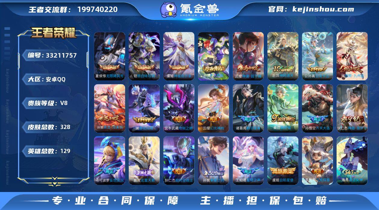 不可二次 安卓Q-V8-至尊星耀IV段位-129英雄-328皮肤-3典藏皮肤-1珍品传说-19传说-110史诗 QW264710 【英雄全皮】:孙权全皮,苍全皮,敖隐全皮,阿古朵全皮,戈娅全皮,影全皮 【荣耀典藏】:夏侯惇无限飓风号,铠银白咏叹调,虞姬神鉴启示录 【珍品传说】:孙策时之奇旅 【传说皮肤】:云缨神骥越千峰,后羿神树通天,公孙离云诺千山,澜愿照九州拓,云缨幻光神枪,嬴政玄雷天君,桑启鸣野蒿,孙策乘龙淬吴钩,澜逐花归海,马可波罗妄想实况,诸葛亮鹤羽星尊,孙悟空齐天大圣,狄仁杰神器狴犴令,王昭君星穹之声,孙策挚爱之约,李元芳飞鸢探春,虞姬启明星使,宫本武藏地狱之眼,狄仁杰超时空战士 【限定皮肤】:蔡文姬夏日便利店,大乔绒语心约,虞姬夏日便利店,姜子牙天穹之誓,杨戬破阵退雄兵,狄仁杰阴阳师,赵云皇家上将,赵云引擎之心,嬴政优雅恋人,孙尚香蔷薇恋人,庄周高山流水,钟无艳超时空战士,扁鹊奇幻香踪,周瑜赤莲之焰,元歌无心,夏侯惇匿光决锋者,甄姬落雪兰心,典韦岱宗,马可波罗妄想实况,狄仁杰魔术师,狄仁杰神器狴犴令,达摩沙漠行僧,项羽海滩派对,程咬金演武夺筹,王昭君午后时光,王昭君星穹之声,兰陵王金庭之子,孙悟空美猴王,孙悟空孙...