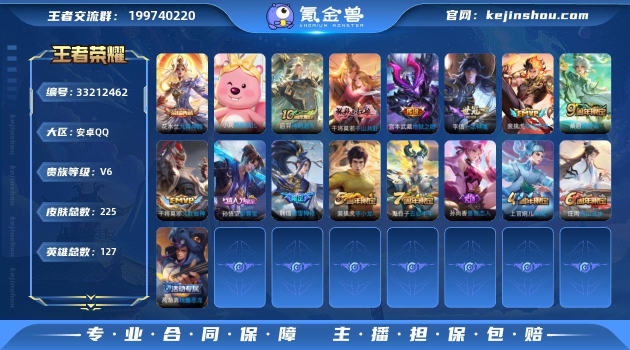 不可二次 安卓Q 1典藏9传说127英雄225皮肤 九霄神辉 神树通天 千山共赴 祥瑞亨通 愿照山河定 鸣野蒿 山海炽霜斩 久胜战神 一念神魔 地狱之眼 万灵启世 涂山容容 守夜人 至尊宝 谪仙醉月 傲雪梅枪 拒霜思 冰冠公主 原初追逐者 梁祝 赞萌露比 黄忠百相守梦 雪豹霜爪 器灵浮梦炉 飞车小橘子 百解令 无限星赏官 李小龙 水晶猎龙者 暗隐猎兽者 猫狗日记女 金属风暴 地狱岩魂 特工魅影 曙光守护者 特工战影 蔷薇恋人 玩趣恶龙 舞动绿茵 逐浪之夏 心灵战警 魅语 千年之狐 紫霞仙子 圣诞恋歌 幽灵船长 乘风破浪 圣诞狂欢 末日机甲男 星夜王子 节奏热浪 天才门将 绅士熊喵 时之恋人女 街头霸王 箭羽风息 月团寄思 缤纷独角兽 鹰眼统帅 魔术师 王者荣耀账号