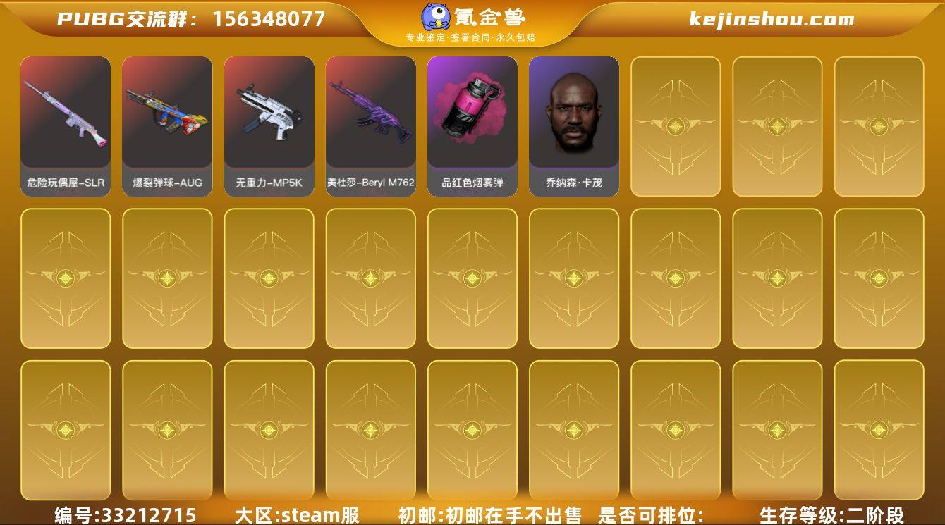 生存等级:二阶段 卖家说:700➕时长,多个成长型武器,兰博基尼SUV。滑雪镜,发光手臂,绿东,圣诞长裤,多个夹克,红色高帮运动鞋。两个烟弹,一个烟枪,饮料瓶。祝老板发财顺意!
