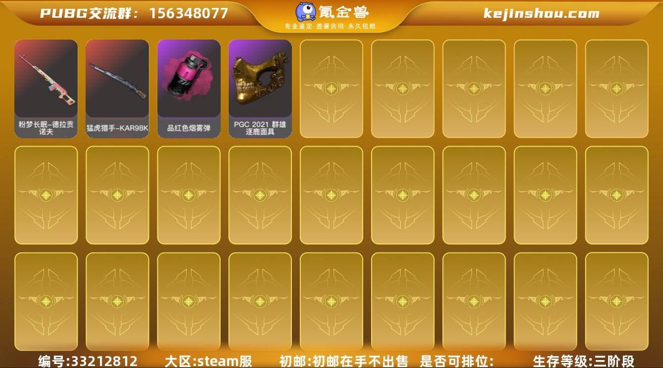账号来源: 自营 初邮情况: 初邮在手不出售 热门装扮: 渔夫帽 拥有成长型武器: 美杜莎-Beryl M762