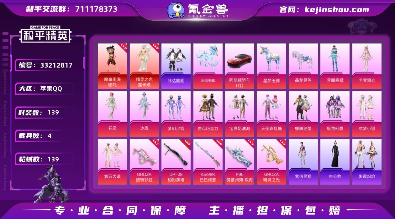苹果 手Q-2神装-12粉装-6特效枪-4载具-4粉色飞行器-60742热力值-11王牌印记-139套装-139枪皮 【红色神装等级】:魔童闹海-哪吒(二级),精灵之光-露米娜(二级) 【红色角色神装】:魔童闹海-哪吒,精灵之光-露米娜 【热门品类】:粉装-梦幻火箭,套装-浪漫天命,套装-胖达圆圆,套装-暗影哥特,套装-浪漫波比,角色-8号机,角色-Mark.06 【粉色套装】:粉装-甜心巧克力,粉装-宝贝奶油派,粉装-天使彩虹糖,粉装-蝶舞迷情,粉装-梦幻火箭,粉装-极致幻想,粉装-甜梦小狐,粉装-第五大道,角色-花灵,角色-冰魄,角色-羊梦糖心,角色-异瞳寒姬 【粉色枪皮等级】:GROZA-旋转彩虹(七级),GROZA-精灵之光(三级),P90-魔童闹海 敖丙(三级),Kar98K-巳巳如意(四级),Mk14-福马献瑞(一级),DP-28-豹影疾电(五级) 【粉色载具】:阿斯顿马丁DBS(红),僚机-冰龙团团,星梦玉骢,晶梦灵驹,冰绡玉鳞 【粉色枪皮】:GROZA-旋转彩虹,GROZA-精灵之光,P90-魔童闹海 敖丙,Kar98K-巳巳如意,Mk14-福马献瑞,DP-28-豹影疾电 【粉色飞行器】:炫彩糖果飞行器,星梦奇缘飞行器,曦光华影飞行器,灵珠游龙飞行器 【粉色降落伞】:甜心宝贝降落伞,春暖花开降落伞,梦幻火箭降落伞,神秘黑猫降落...