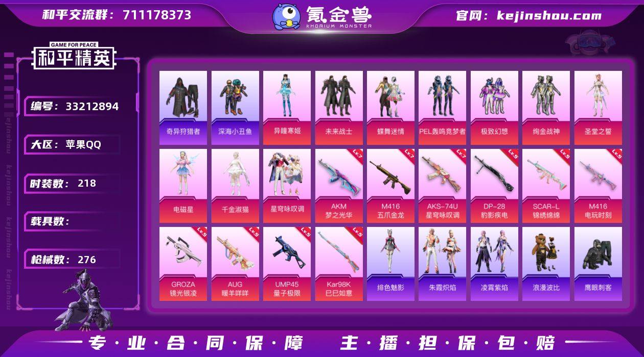 苹果 手Q-10粉装-11特效枪-0载具-1粉色飞行器-86124热力值-22王牌印记-218套装-276枪皮 【热门品类】:套装-浪漫天命,套装-深海小丑鱼,套装-小丑鱼,套装-奇异狩猎者,套装-暗夜之虎,套装-龟仙人,套装-浪漫波比 【粉色套装】:粉装-未来战士,粉装-蝶舞迷情,粉装-PEL轰鸣竞梦者,粉装-极致幻想,粉装-绚金战神,角色-圣堂之誓,角色-电磁星,角色-千金淑猫,粉装-星穹咏叹调,角色-异瞳寒姬 【粉色枪皮等级】:AKM-梦之光华(七级),SCAR-L-锦绣绵绵(五级),M416-五爪金龙(七级),M416-电玩时刻(五级),GROZA-镜光银凌(五级),AUG-暖羊咩咩(五级),UMP45-量子极限(五级),AKS-74U-星穹咏叹调(七级),Kar98K-巳巳如意(五级),AA12-G-萌骑幻想(五级),DP-28-豹影疾电(五级) 【粉色枪皮】:AKM-梦之光华,SCAR-L-锦绣绵绵,M416-五爪金龙,M416-电玩时刻,GROZA-镜光银凌,AUG-暖羊咩咩,UMP45-量子极限,AKS-74U-星穹咏叹调,Kar98K-巳巳如意,AA12-G-萌骑幻想,DP-28-豹影疾电 【粉色飞行器】:脆鲨七海飞行器 【粉色降落伞】:深海曼妙降落伞,梦幻火箭降落伞,神秘黑猫降落伞,古堡领主降落伞,甜蜜誓约降落伞,心之恋语降落伞,暗夜玫瑰降落伞,天之羽翼降落伞,碧影闪...