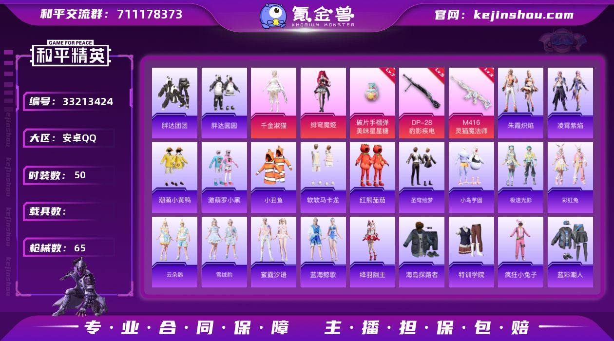 安卓【小号 套装-胖达团团,套装-胖达圆圆,M416-灵猫魔法师(三级),破片手榴弹-美味星星糖(七级)】 手Q-2粉装-5特效枪-0载具-2粉色飞行器-20688热力值-2王牌印记-50套装-65枪皮 【热门品类】:套装-小丑鱼,套装-胖达团团,套装-胖达圆圆,套装-潮萌小黄鸭,套装-软软马卡龙,套装-红熊茄茄 【粉色套装】:角色-千金淑猫,角色-绯穹魔姬 【粉色枪皮等级】:M416-灵猫魔法师(三级),Mk14-福马献瑞(二级),AA12-G-萌骑幻想(四级),DP-28-豹影疾电(五级),破片手榴弹-美味星星糖(七级) 【粉色枪皮】:M416-灵猫魔法师,Mk14-福马献瑞,AA12-G-萌骑幻想,DP-28-豹影疾电,破片手榴弹-美味星星糖 【粉色飞行器】:宁雨蝶飞行器,灵猫魔法师飞行器 【粉色降落伞】:荧海星豚降落伞,灵猫魔法师降落伞,桃源时光降落伞,异瞳寒姬降落伞 【稀有套装】:套装-圣穹绘梦,套装-小鸟芋圆,套装-马上来财,套装-极速光影,套装-彩虹兔,套装-云朵鹅,套装-雪绒豹,套装-蜜露汐语,套装-蓝海鲸歌,角色-绛羽幽主,套装-朱霞炽焰,套装-凌霄紫焰,套装-雨过天青,套装-红釉青花,角色-暖阳柴柴,套装-燕雀桃枝 【稀有枪皮】:AKM-缤纷海域,AKM-灵猫魔法师,SCAR-L-夜灯,GROZA-荧海星豚,M7...