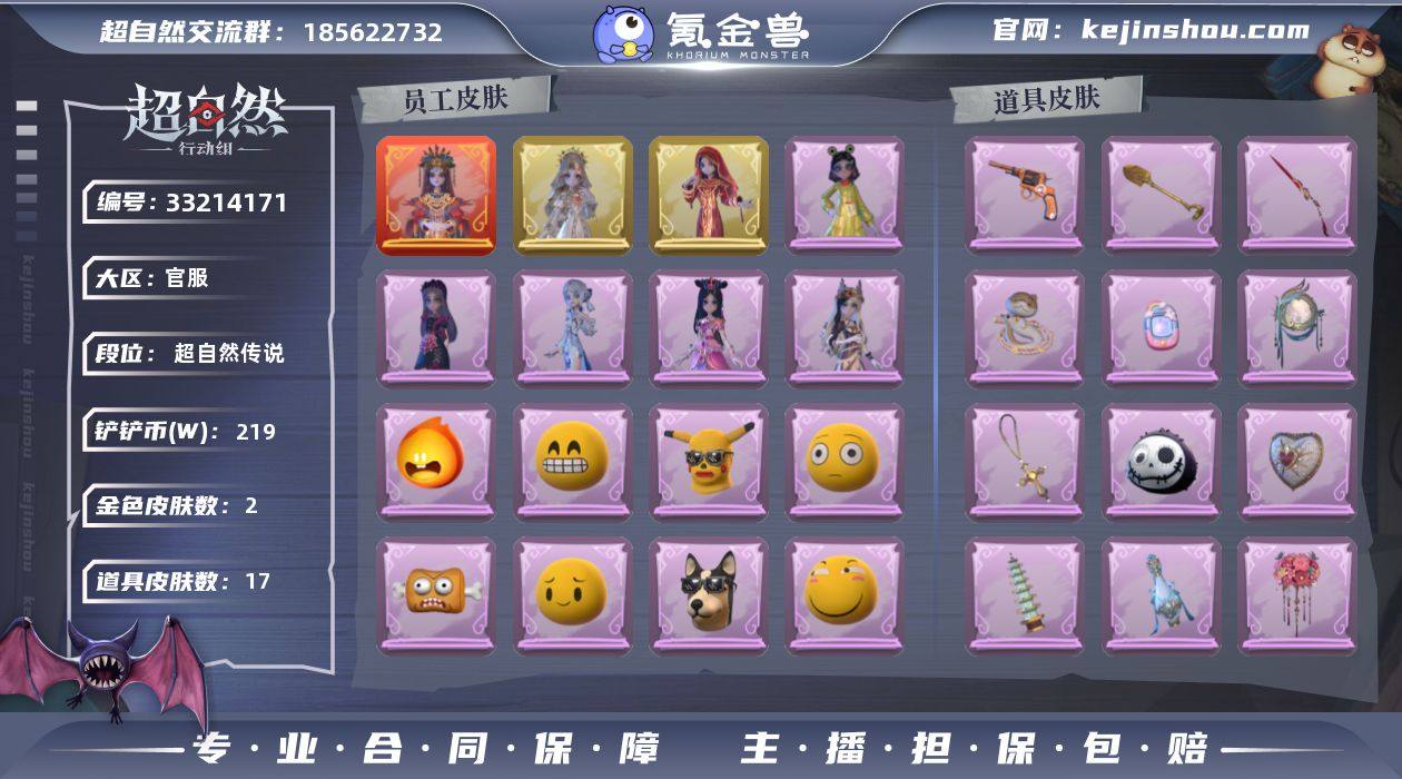 ZR110,红皮:1,金皮:2,紫皮:5,道具皮:17,外观:巫铃儿-镜生遗梦,薇薇安-圣光之谕,巫铃儿-镜花辞,小黄-罗丽,薇薇安-白光莹,巫铃儿-素影瑶光,爱丽丝-丝缕哀歌,小黄-呱呱雨衣,道具:黄牛能量饮料-青玉抱丹,腰包-宝剑八,音响-happy猫,急救包-蔷薇物语,音响-鸣沙鼓,桃木剑-凤鸣九天,额外的背包-飞花令,夜视仪-金丝眼镜,传送按钮-昆仑镜,腰包-惊魂娃娃,传送按钮-幻宠之门,葫芦-伏妖塔,转轮手枪-新星时代,铲子-龙鳞,摸金符-祝祷词,长鞭-小狗蛇点点鞭,背饰-蝶恋花,员工:小黄,爱丽丝,零,阿念,逍遥,薇薇安,巫铃儿,莉莉,艾伦,爱德华,兰,小满,动作:luvaboy,鸳鸯戏,刀马舞,DL摇,鹏友摇,心跳摇,小雨摇,舞台中心,举牌,抬手,头饰:小财神豚豚头套,鱼头怪头套,烈焰红唇头套,大葱明头套,火爆了头套,面具马头套,哈士奇头套,萨卡班甲鱼头套,嘻嘻头套,滑稽头套,呆滞头套,卑微头套,咬咬鲨头套,炙热烧烤,像素朋克墨镜,后室幸存者头套,挂饰:未竟乐园,小鲨包包,钗头凤,赛季魔盒:普通魔盒,累充:18700金砖,段位:超自然传说,铲铲币:219w