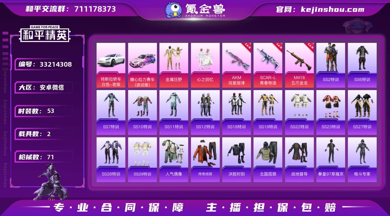 【特价出售/店主推荐】安卓 微信-2粉装-3特效枪-2载具-1粉色飞行器-27740热力值-2王牌印记-53套装-71枪皮【热门品类】:套装-SS1特训【粉色套装】:粉装-金属狂野,粉装-心之回忆【粉色枪皮等级】:AKM-炫紫旋律(四级),SCAR-L-青春物语(四级),M416-五爪金龙(四级)【粉色载具】:特斯拉Model 3(珍珠白),糖心拉力赛车(波动紫)【粉色枪皮】:AKM-炫紫旋律,SCAR-L-青春物语,M416-五爪金龙【粉色飞行器】:纯梦嫁纱飞行翼