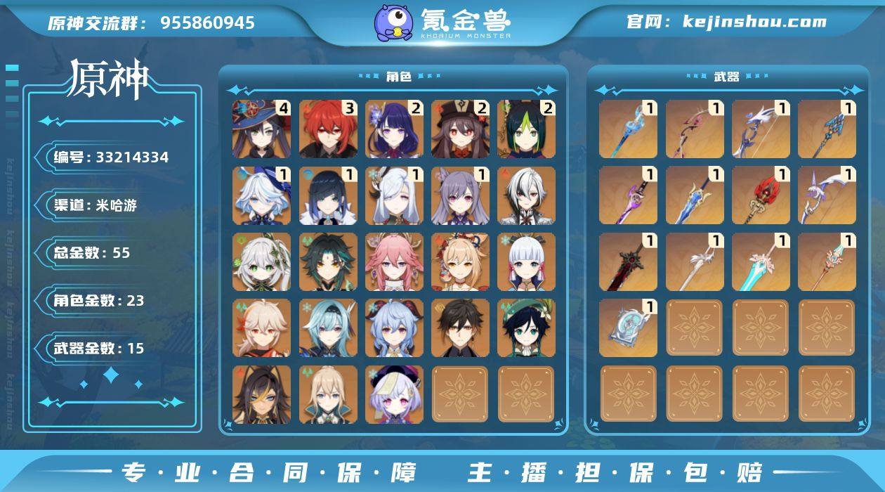 【AYY1097】59级/55黄/男主/23个五星角色/15个五星武器/一命芙宁娜/阿蕾奇诺/一命夜兰/钟离/枫原万叶/魈/一命申鹤/神里绫华/二命雷电将军/纳西妲/二命胡桃/温迪/优菈/甘雨/八重神子/四命莫娜/宵宫/三命迪卢克/二命提纳里/琴/七七/一命刻晴/迪希雅/若水/阿莫斯之弓/四风原典/息灾/天空之脊/护摩之杖/松籁响起之时/静水流涌之辉/雾切之回光/风鹰剑/最初的大魔术/狼的末路/天空之傲