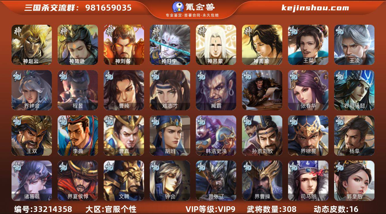 【4736】官阶:骠骑将军;VIP等级:VIP9;史诗武将数量:28;动态皮肤数量:16;武将总数:308;史诗宝珠数量:36;将魂数量:1872;神将:4;魏国史诗武将:8;蜀国史诗武将:6;吴国史诗武将:2;群史诗武将:10