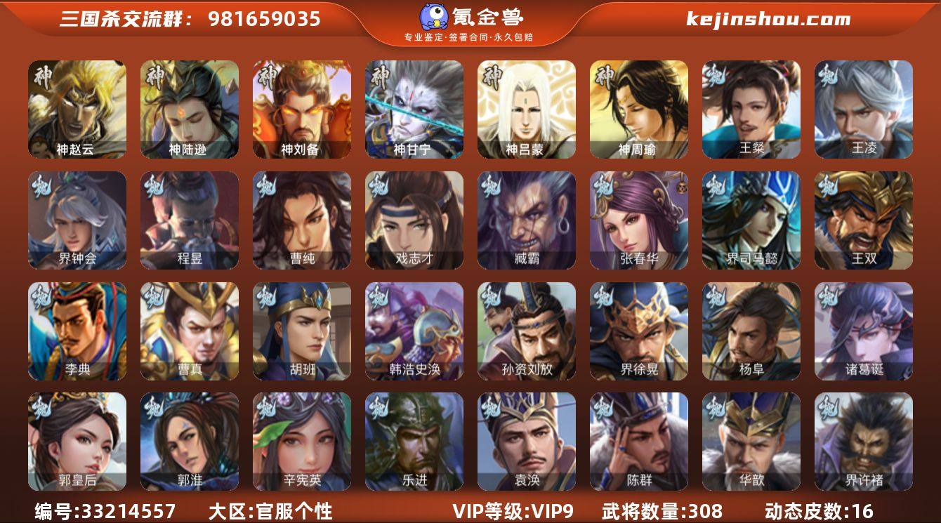 官阶:骠骑将军;VIP等级:VIP9;史诗武将数量:28;动态皮肤数量:16;武将总数:308;史诗宝珠数量:36;将魂数量:1872;神将:4;魏国史诗武将:8;蜀国史诗武将:6;吴国史诗武将:2;群史诗武将:10