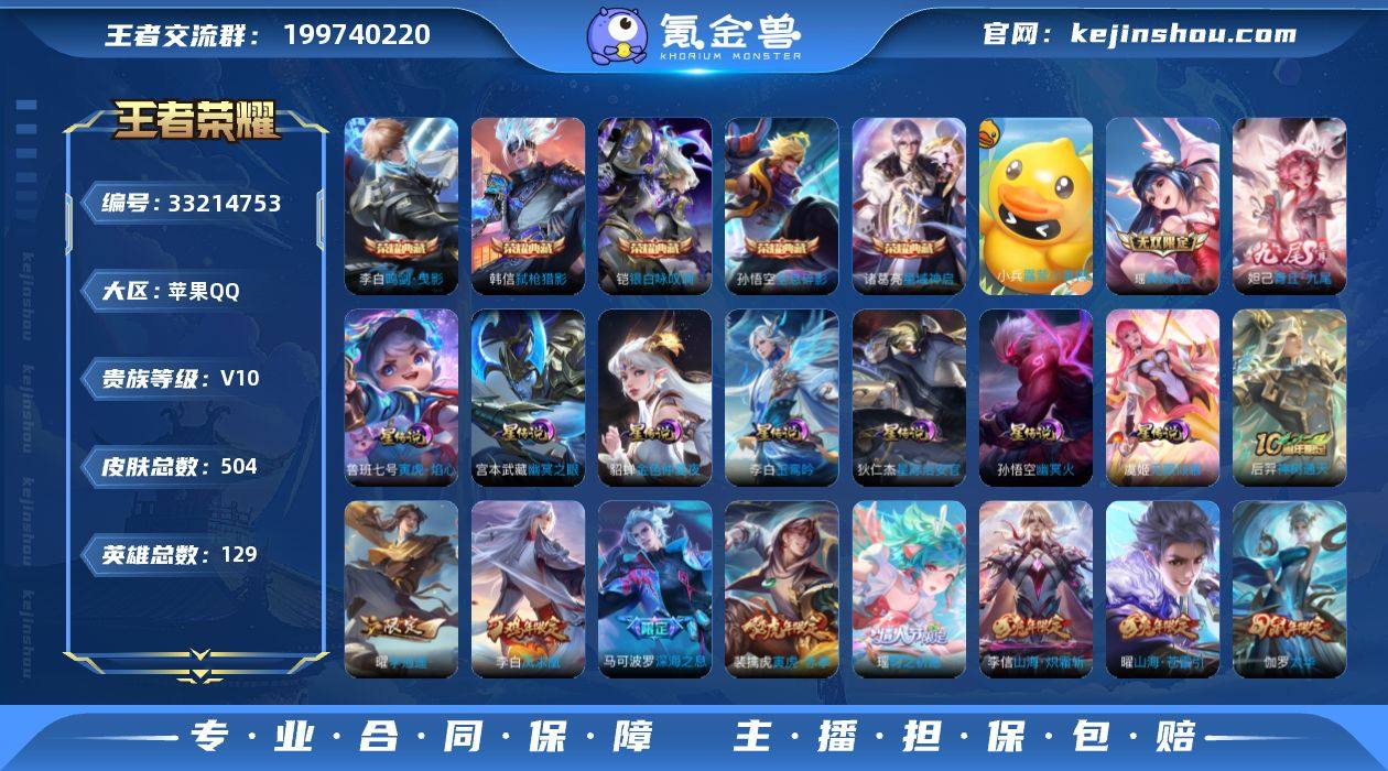实名: 可修改 贵族等级: V10 英雄数: 129 皮肤数: 504 荣耀水晶: 鸣剑·曳影,全息碎影,星域神启,银白咏叹调,弑枪猎影 小兵皮肤: 露营小黄鸭 无双皮: 真我赫兹(瑶),青丘·九尾 星传说: 幽冥之眼,幽冥火,金色仲夏夜,星际治安官,无限倾慕,玉鸾吟,寅虎·焰心 亮点: 【精品号手慢无】历史王者印记18,141抽积分夺宝,个性按键9,1改名卡,打野35段 对抗路26段!