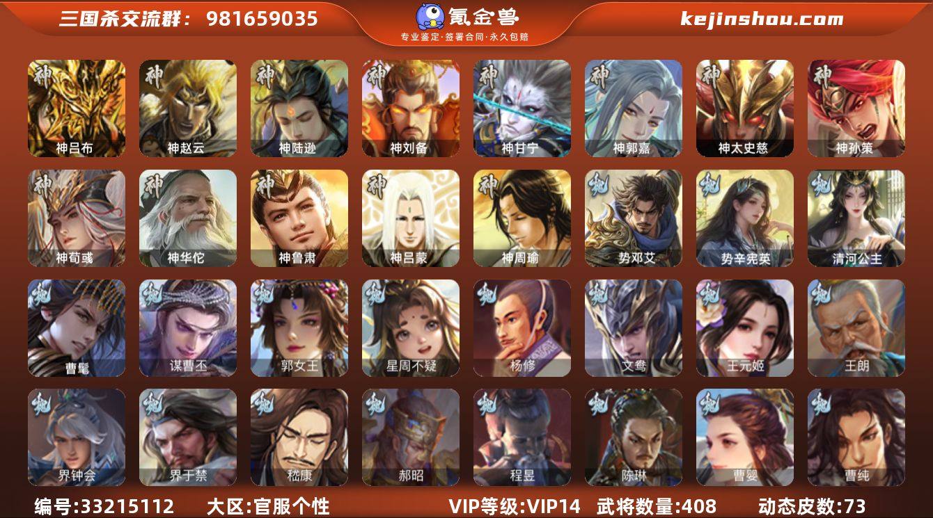 官阶:大将军;VIP等级:VIP14;史诗武将数量:74;动态皮肤数量:73;武将总数:408;史诗宝珠数量:36;将魂数量:7062;神将:11;魏国史诗武将:27;蜀国史诗武将:13;吴国史诗武将:11;群史诗武将:21 神吕布,神赵云,神陆逊,神刘备,神甘宁,神郭嘉,神太史慈,神孙策,神荀彧,神华佗,神鲁肃,曹髦,郭女王,星周不疑,杨修,王元姬,王朗,界钟会,界于禁,嵇康,郝昭,陈琳,曹婴,曹纯,戏志才,谋曹丕,清河公主,势辛宪英,程昱,势邓艾,关索,谋诸葛亮,马云騄,谋黄忠,谋夏侯氏,谋赵云,张星彩,王平,界黄忠,花鬘,董允,谋关羽,势魏延,谋黄盖,吴景,孙皓,孙寒华,骆统,界朱然,界徐盛,界步练师,势陆郁生,文鸯,十常侍,谋貂蝉,界沮授,郑玄,张让,杨彪,星黄忠,星甘宁,王允,麹义,庞德公,南华老仙,刘焉,沮授,界左慈,界李儒,杜预,许攸,势于吉,友诸葛亮,兀突骨,神吕蒙,神周瑜,SP关羽,SP蔡文姬,乐进,曹昂,诸葛诞,朱灵,文聘,SP姜维,张春华,钟会,曹冲,郭淮,满宠,界王异,界曹操,界司马懿,界夏侯惇,界张辽,界许褚,界郭嘉,李典,曹真,韩浩史涣,陈群,曹叡,曹休,钟繇,司马朗,王基,李通,郭皇后,孙资刘放,辛宪英,吕虔,鲁芝,蒯越蒯良,界典韦,界荀彧,杜畿,界曹丕,张恭,界曹植,界满宠,界郭淮,卞夫人,界陈群,蔡贞姬,袁涣,王双,崔琰,毛...