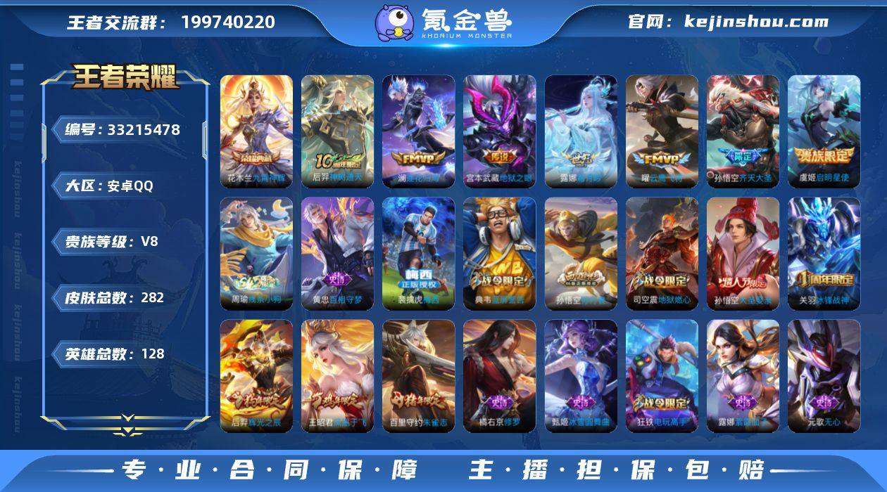 贵族8/皮肤282/典藏1/传说7/史诗64/英雄128/敖隐全皮/影全皮/九霄神辉/神树通天/澜逐花归海/霜月吟/齐天大圣/启明星使/云鹰飞将/地狱之眼/狰(s8)/阴阳师/凯尔特女王(s7)/皇家上将/白昼王子/蜃楼王(s4)/高山流水/超时空战士-钟无艳/妖精王(s5)/炼金王(s6)/奇幻香踪/重明(s11)/猎兽之王/无心/朔风刀(s17)/落雪兰心/烛龙(s10)/穷奇(s12)/蓝屏警告/魔术师/万华元夜(s22)/沙漠行僧(s26)/海滩派对/冰锋战神/逐梦之音/凤凰于飞/午后时光/金庭之子(s27)/狮心王(s3)/大圣娶亲/孙行者/御旌(s15)/辉光之辰/云中旅人(s29)/驱傩正仪(s24)/遇见飞天/潮玩骑兵/朔望之晖/饕餮(s9)/五谷丰年/千军破阵(s25)/原初追遂者/朱雀志/混沌棋(s18)/大漠名商(s28)/疑决卦(s19)/擒涛扼浪(s31)/御狮(s13)/电玩高手/御霄(s14)/御銮(s16)/梁祝/拒霜思/暖冬·兔眠/玲珑珍味/探海日志(s32)/海盐诗旅(s30)/星界游侠/驭风魔法/女武神/流音漫舞/地狱燃心/江河有灵/古海寻踪(s33)/梅西/百解令(蒙犽)/蒙恬荣光圣徽/高渐离燃音魔法/妲己灵卜魔法/鬼谷子天穹祈灯(S34)/剑破天穹(s35)/熔金海岸/逆浪荇歌/线条小狗-周瑜/钟馗锁墨魂/百相守梦-黄忠/电玩·爆裂旋风/时之奇旅-安琪拉/天秀·启明/时之恋人-孙尚香/修罗/鹰眼统帅/...