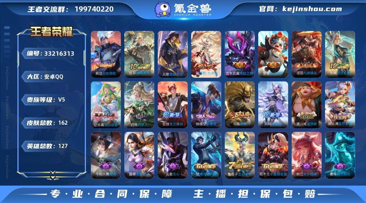 【V5 1典藏 6传说 162皮肤 127英雄】10印记 打野21 弑枪猎影 至尊宝 神威 逐花归海 胖达荣荣 地狱之眼 愿照·九州拓 诡秘之主 猪悟能 5-10hw20-04,编号:KXUUW49