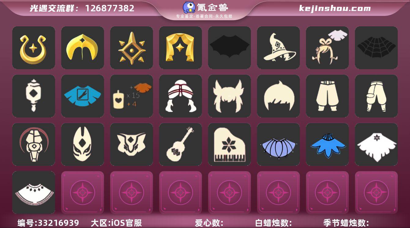 账号类型: 手机账号 季节已毕业: 魔法季,圣岛季,预言季,表演季 完成地图: 晨岛,云野,雨林,霞谷,暮土 珍稀物品: 阿努比斯(狗头),白枭,魔法季耳坠 礼包: 蝙蝠套,巫师,绊爱,蜘蛛斗,灯笼,tgc,创始人 裤子: 武士裤,搓澡巾 面具: 黄鼠狼,红狐狸,阿努比斯 发型: 正太,公主头,白枭 斗篷: 白金,白鸟斗,花瓣斗篷,荧蓝斗篷 配饰: 高音钢琴,吉他 亮点: 重塑药水28