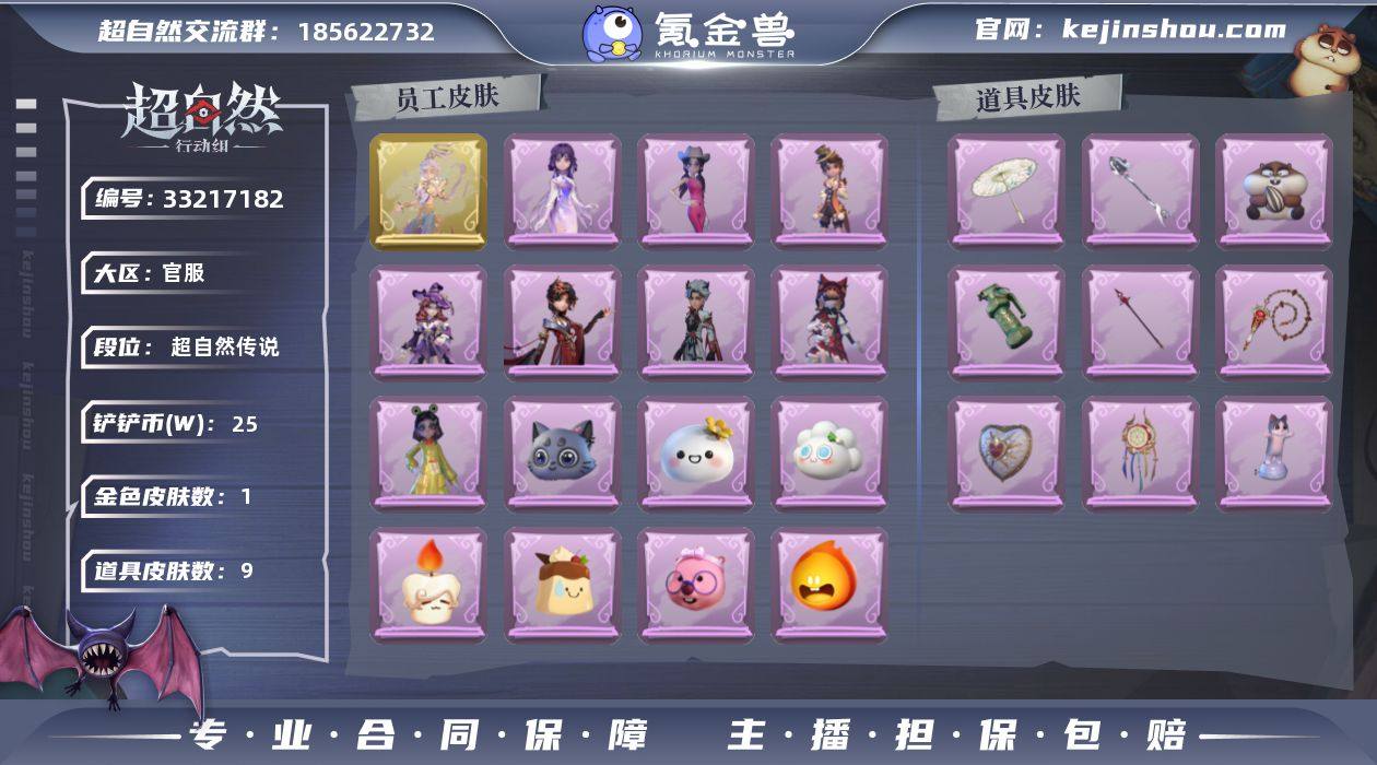 金色皮肤数量: 1 紫色皮肤数量: 8 道具皮肤数量: 9 段位: 超自然传说 外观: 嘻嘻头套,烈焰红唇头套,呆滞头套,卑微头套,哈士奇头套,滑稽头套,鱼头怪头套,面具马头套,萨卡班甲鱼头套,呱呱雨衣,火爆了头套,莲华渡,精致露比头套,莓果陷阱,糖果守卫,樱桃奶油布丁,仙锋小姐,千夜星谕,黎明猎手,白鼬趴趴,耀眼的你,庆宴绮愿,烛光纪念,拂云仙,牛啤背包,琢玉怀乡,饺饺者头套,孤独对望,煤球喵,芝麻糊汤圆