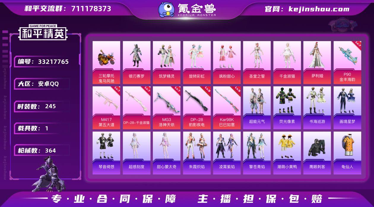 【kyhp316】安卓 手Q-10粉装-6特效枪-1载具-3粉色飞行器-113167热力值-6王牌印记-245套装-364枪皮 【热门品类】:套装-龟仙人,套装-潮萌小黄鸭,套装-红熊茄茄 【粉色套装】:粉装-银刃赛罗,粉装-筑梦精灵,粉装-旋转彩虹,粉装-飒粉甜心,角色-圣堂之誓,角色-千金淑猫,角色-萨利娅,角色-罪夜之冕 【粉色枪皮等级】:P90-金丰海韵(七级),Kar98K-巳巳如意(五级),M417-第五大道(七级),DP-28-千金淑猫(七级),DP-28-豹影疾电(五级),MG3-洛神天依(七级) 【粉色载具】:鬼马风驰 【粉色枪皮】:P90-金丰海韵,Kar98K-巳巳如意,M417-第五大道,DP-28-千金淑猫,DP-28-豹影疾电,MG3-洛神天依 【粉色飞行器】:黄族统领飞行器 【粉色降落伞】:绝对恒星降落伞,PEL轰鸣竞梦者降落伞,繁花小夜曲降落伞,潮汐统领降落伞,夏日绵绵冰降落伞,暗夜玫瑰降落伞,洛神天依降落伞,流星咚咚降落伞,恐龙拽拽降落伞,妙趣可丽降落伞,太空嘟嘟降落伞,第五大道降落伞,闲梦青缨降落伞,圣堂之誓降落伞,繁龙极客降落伞,江南烟雨降落伞,霓虹漫游降落伞,星空武士降落伞,精灵梦叶罗丽降落伞,守护天翼降落伞,拳皇·狂花道降落伞,精灵之光降落伞,千金淑猫降落伞,极意拳锋降落伞...
