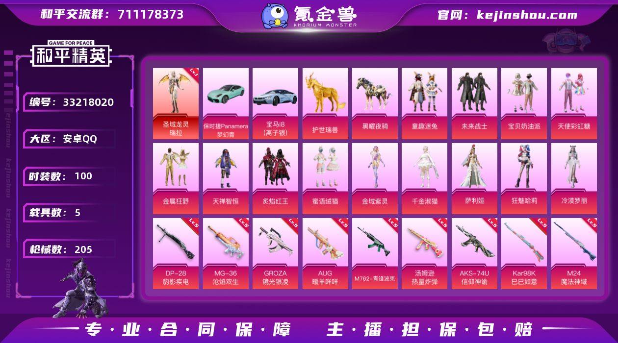 【公主妹妹号·2神装·艾丽娅·龙女·童趣迷兔·番茄·千金淑猫·小丑女·20粉枪·5载具】安卓 手Q-2神装-13粉装-20特效枪-5载具-15粉色飞行器-74755热力值-8王牌印记-100套装-205枪皮 【红色神装等级】:暮色玫影-艾丽娅(二级),圣域龙灵-瑞拉(一级) 【红色角色神装】:暮色玫影-艾丽娅,圣域龙灵-瑞拉 【热门品类】:粉装-童趣迷兔,角色-8号机,角色-Mark.06,套装-红熊茄茄 【粉色套装】:粉装-未来战士,粉装-宝贝奶油派,粉装-天使彩虹糖,粉装-金属狂野,粉装-天禅智恒,粉装-童趣迷兔,粉装-炙焰红王,粉装-蜜语绒猫,角色-金域紫灵,角色-千金淑猫,角色-萨利娅,角色-狂魅哈莉,角色-冷漠罗丽 【粉色枪皮等级】:AKM-幽焰骑士(三级),SCAR-L-梦幻火箭(四级),SCAR-L-时空协奏(三级),GROZA-镜光银凌(五级),AUG-暖羊咩咩(五级),M762-青锋波束(五级),M762-鬼刀(四级),Famas-初号机 觉醒Ver.(四级),ACE32-萌骑漫游(五级),汤姆逊-热量炸弹(五级),AKS-74U-信仰神谕(五级),AKS-74U-森灵之息(四级),P90-沙丘之主(三级),Kar98K-巳巳如意(五级),Kar98K-圣域龙灵(三级),M24-魔法神域(五级),Mk14-盛世惊鸿(三级),Mk14-甜梦熊击(五级),DP-28-豹影疾电(五级),MG-36-沧焰双...