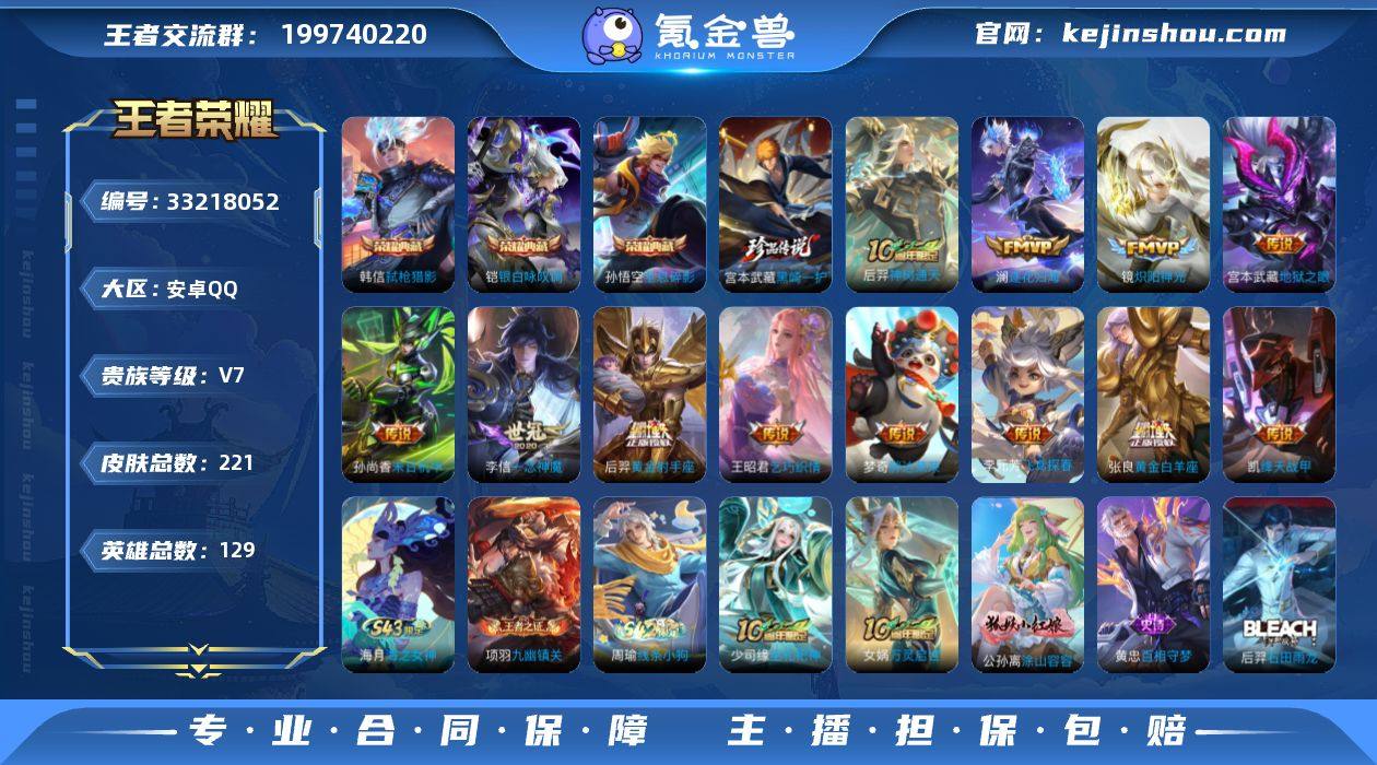 【打野号男神把妹得吃号·221皮3典藏1珍品12传说9按键限定皮肤多·全息碎影·银白咏叹调·弑枪猎影】 安卓Q-V7-永恒钻石IV段位-129英雄-221皮肤-3典藏皮肤-1珍品传说-12传说-54史诗 【英雄全皮】:敖隐全皮 【荣耀典藏】:孙悟空全息碎影,铠银白咏叹调,韩信弑枪猎影 【珍品传说】:宫本武藏黑崎一护 【传说皮肤】:后羿神树通天,澜逐花归海,王昭君乞巧织情,李元芳飞鸢探春,铠绛天战甲,镜炽阳神光,李信一念神魔,张良黄金白羊座,梦奇胖达荣荣,后羿黄金射手座,孙尚香末日机甲,宫本武藏地狱之眼 【限定皮肤】:姜子牙天穹之誓,狄仁杰阴阳师,赵云皇家上将,孙尚香蔷薇恋人,钟无艳王者之锤,元歌无心,狄仁杰魔术师,狄仁杰万华元夜,达摩沙漠行僧,项羽海滩派对,程咬金演武夺筹,兰陵王金庭之子,孙悟空至尊宝,孙悟空孙行者,李元芳云中旅人,钟馗驱傩正仪,雅典娜黎明之约,鬼谷子原初探秘者,鬼谷子五谷丰年,苏烈千军破阵,沈梦溪大漠名商,裴擒虎擒涛扼浪,鲁班大师探海日志,桑启海盐诗旅,艾琳女武神,张良古海寻踪,蒙恬荣光圣徽,鬼谷子天穹祈灯,沈梦溪龙舞盛年,鲁班七号蔬乡物语,李元芳蔬乡物语,刘邦剑破天穹,程咬金群星魔术团,刘备异域游侠,周瑜熔...