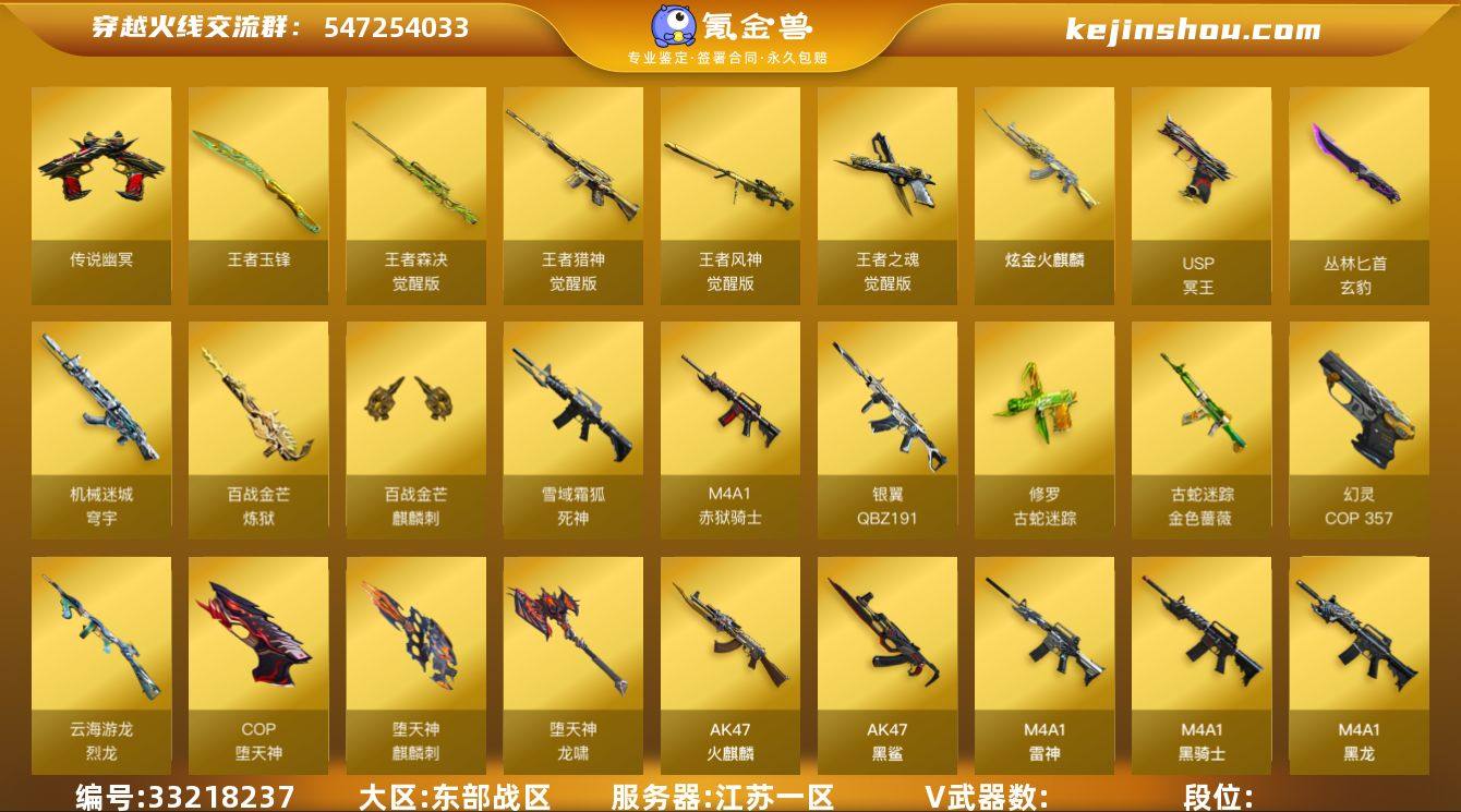 实名: 可修改 V武器: AK47-火麒麟,AK47-黑鲨,M4A1-雷神,M4A1-黑骑士,M4A1-黑龙,M4A1-堕天神,M4A1-青龙,M4A1-猎神,Barrett-毁灭,Barrett-极光,AWM-裁决,M200-幻神,Kar98k-星神,AN94-超新星,QBZ03-金色蔷薇,Scar Light-白虎,9A91-烈火,沙鹰-修罗,屠龙,龙啸,擎天,M4A1-幻灵,柯尔特-荣耀世冠,擎天-竞技荣光,幻灵之锋,王者玉锋,柯尔特-冠军之特,传说幽冥,龙啸-烈火龙威,擎天-云海游龙,龙啸-堕天神,麒麟刺-堕天神,COP-堕天神,烈龙-云海游龙,COP 357-幻灵,金色蔷薇-古蛇迷踪,修罗-古蛇迷踪,QBZ191-银翼,死神-雪域霜狐,M4A1-赤狱骑士,麒麟刺-百战金芒,炼狱-百战金芒,机械迷城-穹宇,从林匕首-玄豹,USP-冥王 王者武器: 王者之魂-觉醒版,王者风神-觉醒版,王者猎神-觉醒版,王者森决-觉醒版 炫金武器: 炫金火麒麟 热门武器: C.A.T,巴雷特-零-水下丽影,猫猫手套,毁灭-孙三炮,雷神-小红,Scar Light-马枪 狙击枪稀有皮肤: 毁灭-暗月,幻神-CFS2022,星神-AG-CFPLS21冠军皮肤,星神-巅峰荣耀,裁决-羽掣,幻神-AG-CFPL S24冠军,裁决-巅峰荣耀 英雄角色: 审判者,王者-零-国色天香,零,迷迭香,旧-海豹突击队,影豹,电竞教官-云悠悠,职业经理 音效道具: AK47-火麒麟音效卡,M4A1-黑骑士音效卡,死神-雪域霜...