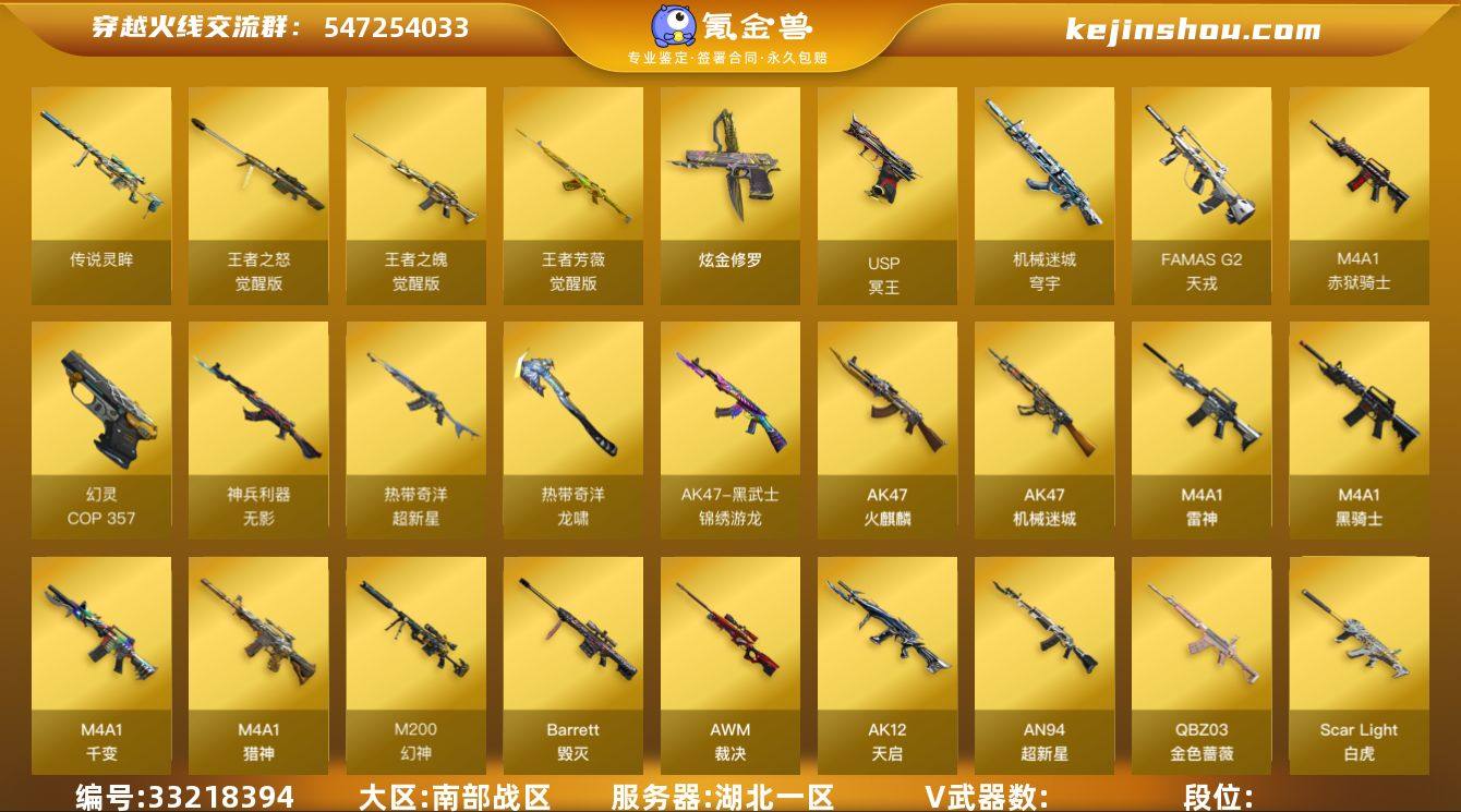 实名: 可修改 V武器: AK47-火麒麟,AK47-机械迷城,M4A1-雷神,M4A1-黑骑士,M4A1-千变,M4A1-猎神,Barrett-毁灭,AWM-裁决,M200-幻神,AN94-超新星,AK12-天启,QBZ03-金色蔷薇,Scar Light-白虎,9A91-烈火,沙鹰-修罗,麒麟刺,火麒麟-荣耀世冠,M200-竞技荣光,柯尔特-荣耀世冠,幻灵之锋,M14EBR-玄武,QBZ03天罚,传说灵眸,烈火-动感闪耀,天神-动感闪耀,屠龙-动感闪耀,屠龙-云海游龙,擎天-云海游龙,AK47-黑武士-锦绣游龙,龙啸-热带奇洋,超新星-热带奇洋,无影-神兵利器,COP 357-幻灵,M4A1-赤狱骑士,FAMAS G2-天戎,机械迷城-穹宇,USP-冥王 王者武器: 王者芳薇-觉醒版,王者之魄-觉醒版,王者之怒-觉醒版 炫金武器: 炫金修罗 热门武器: 火麒麟-绝迹,猫猫手套,天龙-曼陀罗,M4A1-雷神-精英刀锋,裁决-雪莉杨 狙击枪稀有皮肤: 毁灭-荣耀之怒,毁灭耀金皮肤,幻神-巅峰荣耀,星神-AG-CFPLS21冠军皮肤 英雄角色: 王者凌霄,机械姬,王者潘多拉,战地猎狐 音效道具: 白鲨语音包,天神动感闪耀音效卡
