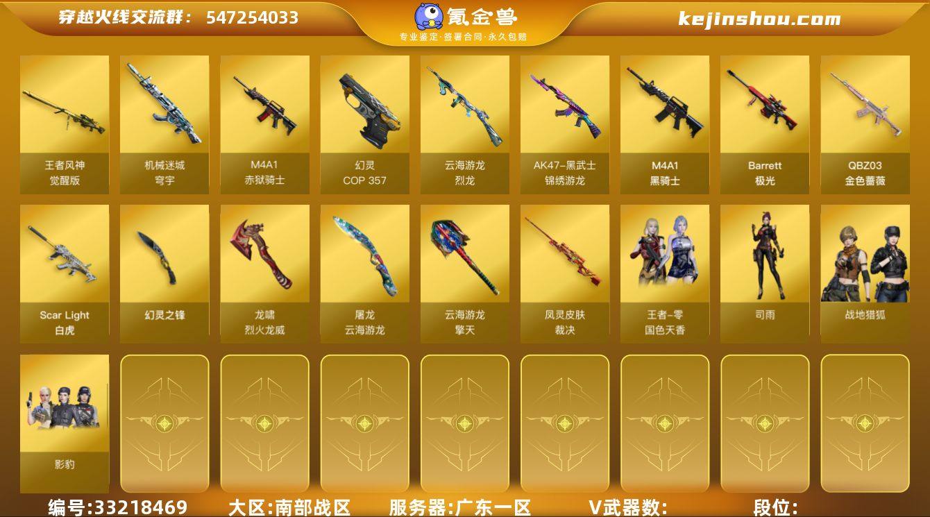 实名: 可修改 V武器: M4A1-黑骑士,Barrett-极光,QBZ03-金色蔷薇,Scar Light-白虎,幻灵之锋,龙啸-烈火龙威,屠龙-云海游龙,擎天-云海游龙,AK47-黑武士-锦绣游龙,烈龙-云海游龙,COP 357-幻灵,M4A1-赤狱骑士,机械迷城-穹宇 王者武器: 王者风神-觉醒版 狙击枪稀有皮肤: AWM-裁决-凤灵皮肤 英雄角色: 王者-零-国色天香,影豹,司雨,战地猎狐