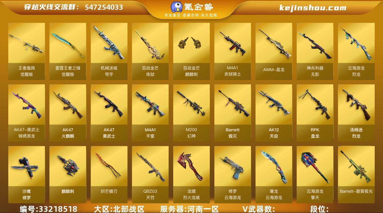 实名: 可修改 V武器: AK47-火麒麟,AK47-黑武士,M4A1-千变,Barrett-毁灭,M200-幻神,AK12-天启,RPK-盘龙,汤姆逊-烈龙,沙鹰-修罗,麒麟刺,QBZ03天罚,炽芒蝶刃,龙啸-烈火龙威,修罗-云海游龙,屠龙-云海游龙,擎天-云海游龙,AK47-黑武士-锦绣游龙,烈龙-云海游龙,无影-神兵利器,AWM-昌龙,M4A1-赤狱骑士,Barrett-碧霄极光,麒麟刺-百战金芒,炼狱-百战金芒,机械迷城-穹宇 王者武器: 雷霆王者之锋-觉醒版,王者凰鸣-觉醒版 热门武器: 斯泰尔-蝴蝶,火麒麟-绝迹,COP-白鲨,猫猫手套 狙击枪稀有皮肤: 毁灭-黑大圣皮肤,毁灭-直播专属 英雄角色: 王者救世主,晴雅,隼,王者炫,战地猎狐,零·纪元y466