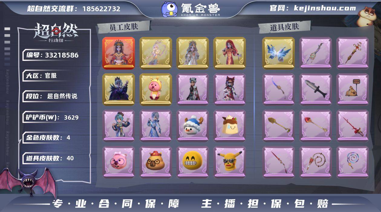 ZR209,红皮:1,金皮:4,紫皮:4,道具皮:40,外观:巫铃儿-镜生遗梦,零-渡鸦公爵,逍遥-莲华渡,薇薇安-圣光之谕,巫铃儿-镜花辞,艾伦-黎明猎手,莉莉-莓果陷阱,阿念-迷途僵宝,零-青云逸歌,道具:铲子-龙鳞,专业手电-星寂,桃木剑-绯色遗证,音响-冬夜暖忆,摸金符-祝祷词,音响-happy猫,桃木剑-凤鸣九天,夜视仪-金丝眼镜,葫芦-伏妖塔,除颤仪-弦外之音,腰包-私藏的银河,急救包-末章心跳,腰包-惊魂娃娃,长鞭-飞天绫,额外的背包-飞花令,铲子-卡皮巴拉小黄豚铲,刺刀-紫气东来,急救包-蔷薇物语,刺刀-小鲨匕首,短管猎枪-赞萌露比水枪,长鞭-缚誓之锁,黄牛能量饮料-青玉抱丹,传送按钮-昆仑镜,铲子-圣心之泪,喷气背包-乘风溯雪,传送按钮-逆时审判,腰包-月下莲台,腰包-宝剑八,背饰-子夜证词,背饰-蜜蜂线索,背饰-兜风日程,背饰-寻凉记,背饰-班卓琴,背饰-晚安仪式,背饰-白鼬趴趴,背饰-潮汐小海兔,背饰-天使的呼唤,背饰-蝶恋花,员工:小黄,爱丽丝,零,阿念,逍遥,薇薇安,巫铃儿,莉莉,艾伦,爱德华,兰,小满,动作:蝴蝶步,孤身摇,知世摇,鹏友摇,心跳摇,伤心摇,舞台中心,九万字舞,带你逃跑吧,举牌,抬手,头饰:太空鲨头套,雪墩墩头套,蒜了八,樱桃奶油布丁,精致露比头套,小财神豚豚头套,鱼头怪头套,烈焰红唇头套,面具...