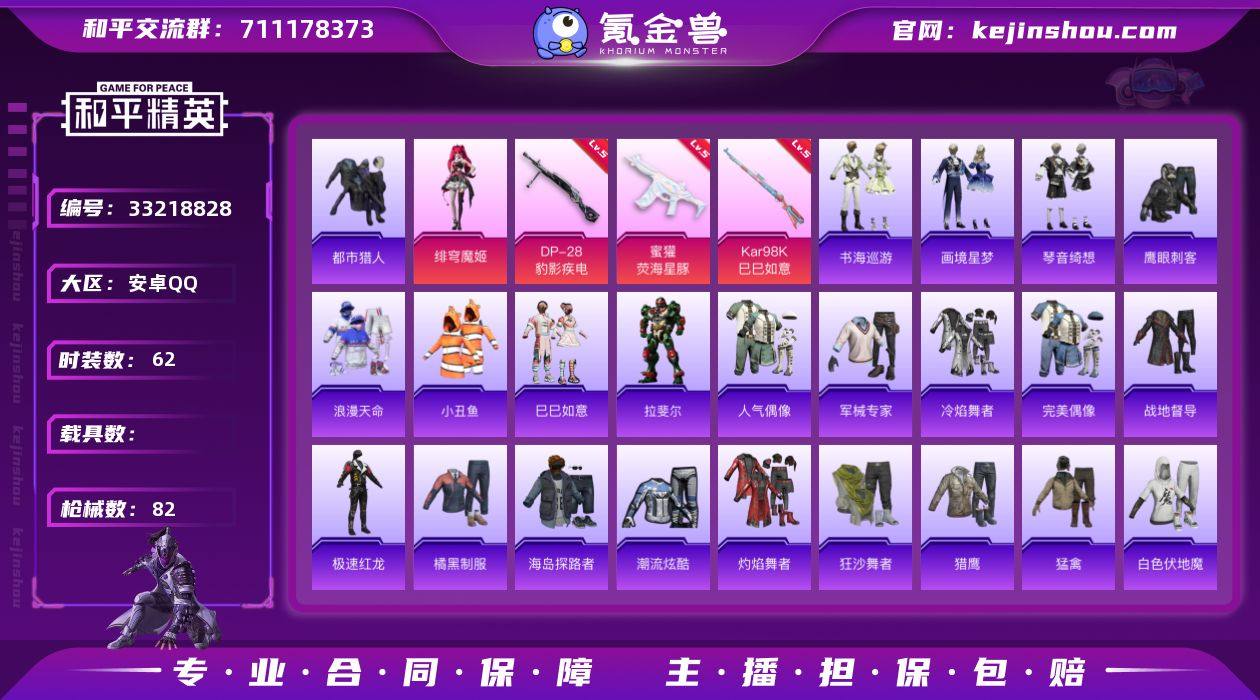 安卓 手Q-1粉装-6特效枪-0载具-0粉色飞行器-20397热力值-3王牌印记-62套装-82枪皮 【热门品类】:套装-浪漫天命,套装-都市猎人,套装-小丑鱼 【粉色套装】:角色-绯穹魔姬 【粉色枪皮等级】:蜜獾-荧海星豚(五级),UMP45-萌骑冒险(三级),AKS-74U-森灵之息(五级),Kar98K-巳巳如意(五级),Mk14-福马献瑞(五级),DP-28-豹影疾电(五级) 【粉色枪皮】:蜜獾-荧海星豚,UMP45-萌骑冒险,AKS-74U-森灵之息,Kar98K-巳巳如意,Mk14-福马献瑞,DP-28-豹影疾电 【粉色降落伞】:精灵梦叶罗丽降落伞,极意拳锋降落伞,炫彩糖果降落伞 【稀有套装】:套装-巳巳如意,套装-马上来财,角色-拉斐尔,套装-书海巡游,套装-画境星梦,套装-琴音绮想,套装-雨过天青,套装-红釉青花 【稀有枪皮】:AUG-冰晶雪宝,AKM-影袭,AKM-破晓战魂,AKM-龙的传人,SCAR-L-夜灯,SCAR-L-炫彩节奏,M416-红色方程式,M416-蓝色火焰,GROZA-影袭,AUG-天降萌叽,M762-天降萌叽,G36C-星穹咏叹调,AC-VAL-天降萌叽,ACE32-画境星梦,UZI-影袭,UZI-红色方程式,UMP45-夜灯,UMP45-生命誓言,UMP45-蓝色火焰,汤姆逊-天降萌叽,汤姆逊-像素花束,MP5K-画境星梦,P90-巳巳如意,Kar98K-影袭,M24-影袭,M24-幻...