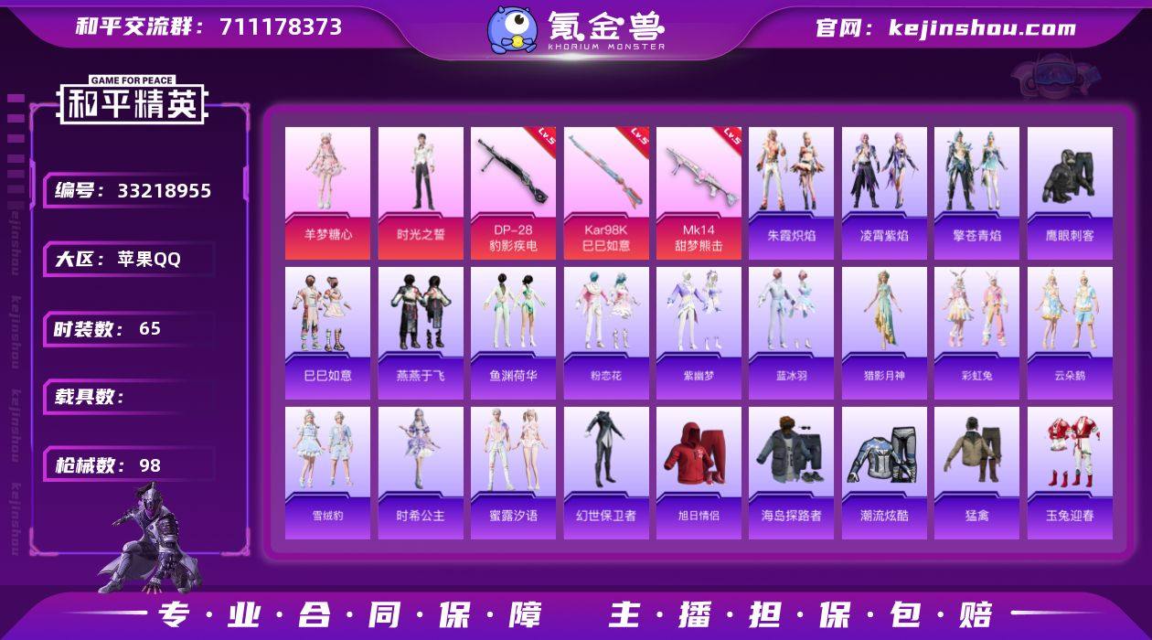 满级地铁苹果 手Q-2粉装-3特效枪-0载具-1粉色飞行器-23470热力值-3王牌印记-65套装-98枪皮 【粉色套装】:角色-时光之誓,角色-羊梦糖心 【粉色枪皮等级】:Kar98K-巳巳如意(五级),Mk14-甜梦熊击(五级),DP-28-豹影疾电(五级) 【粉色枪皮】:Kar98K-巳巳如意,Mk14-甜梦熊击,DP-28-豹影疾电 【粉色飞行器】:炫彩糖果飞行器 【粉色降落伞】:创世·救赎降落伞,炫彩糖果降落伞,小舞降落伞 【稀有套装】:套装-巳巳如意,套装-炫彩糖果,套装-燕燕于飞,套装-鱼渊荷华,套装-粉恋花,套装-紫幽梦,套装-蓝冰羽,角色-猎影月神,套装-彩虹兔,套装-云朵鹅,套装-雪绒豹,角色-时希公主,套装-蜜露汐语,套装-朱霞炽焰,套装-凌霄紫焰,套装-擎苍青焰 【稀有枪皮】:AKM-影袭,AKM-破晓战魂,AKM-极光猎影,SCAR-L-夜灯,SCAR-L-炫彩节奏,SCAR-L-玉兔迎春,M416-红色方程式,M416-蓝色火焰,GROZA-影袭,AUG-甜蜜菠萝,M762-彩虹符号,M762-云朵鹅,AC-VAL-天降萌叽,ARX-凌霄紫焰,UZI-影袭,UZI-红色方程式,UZI-金玉无双,UMP45-夜灯,汤姆逊-像素花束,汤姆逊-智耀战神,MP5K-自由猎手,JS9-凌霄紫焰,P90-巳巳如意,M24-时光之吻,AWM-黄金龙骨,Mini14-耀粉歌者,M417-...