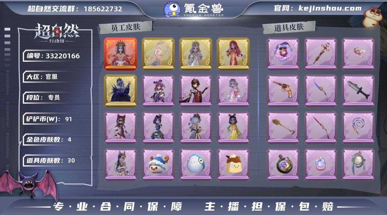 ZR259,红皮:1,金皮:4,紫皮:8,道具皮:30,外观:巫铃儿-镜生遗梦,零-渡鸦公爵,逍遥-莲华渡,薇薇安-圣光之谕,巫铃儿-镜花辞,兰-千夜星谕,薇薇安-仙锋小姐,爱丽丝-甜梦派对,莉莉-莓果陷阱,小黄-异色序曲,莉莉-除妖小师妹,薇薇安-白光莹,小黄-呱呱雨衣,道具:腰包-惊魂娃娃,刺刀-小鲨匕首,音响-happy猫,黄牛能量饮料-珍珠芭乐莓莓,急救包-蔷薇物语,长鞭-飞天绫,葫芦-伏妖塔,额外的背包-飞花令,转轮手枪-新星时代,传送按钮-昆仑镜,折扇-露露扇,夜视仪-金丝眼镜,刺刀-紫气东来,摸金符-紫霄,音响-鸣沙鼓,电击枪-甜蜜泡泡枪,黄牛能量饮料-青玉抱丹,铲子-龙鳞,专业手电-云端梦想计划,传送按钮-逆时审判,传送按钮-幻宠之门,桃木剑-凤鸣九天,急救包-末章心跳,背饰-梵音莲华,背饰-云梦之星,背饰-天使的呼唤,背饰-蝶恋花,员工:小黄,爱丽丝,零,阿念,逍遥,薇薇安,巫铃儿,莉莉,艾伦,爱德华,兰,小满,美妆:暗夜小恶魔,头饰:腊肠扭扭,太空鲨头套,雪墩墩头套,樱桃奶油布丁,惊魂南瓜头套,精致露比头套,小财神豚豚头套,鱼头怪头套,烈焰红唇头套,大葱明头套,火爆了头套,面具马头套,哈士奇头套,萨卡班甲鱼头套,嘻嘻头套,滑稽头套,呆滞头套,卑微头套,像素朋克墨镜,后室幸存者头套,挂饰:九色祥鹿,未竟乐园,...