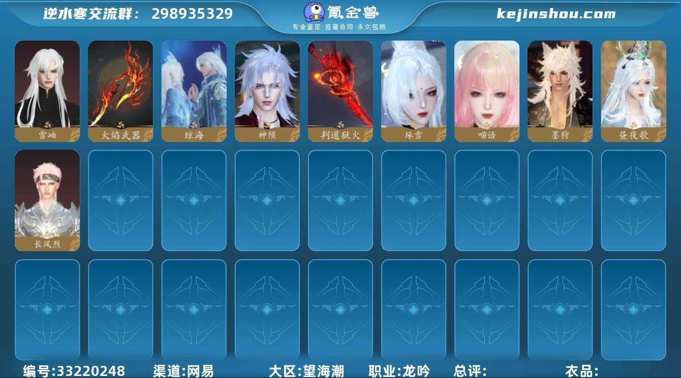 【已用天赏石19-转盘外观1】战力值:1765521 总评:1765521 角色等级:89 衣品值: 222935 国色值: 105770 已用天赏石:19 天霓染数量:5 【网易手机账号】 【无换绑冷却】 【龙吟】 【男】 【6级】 【把酒临风】 【互通】 转盘外观1 副本外观1 天赏外观9 转盘外观:长风烈; 副本外观:白夜拂雪; 天赏外观:雪岫,墨狩,神陨,琢雪,喵语,昼夜歌,琼海,火焰武器,狱火武器;