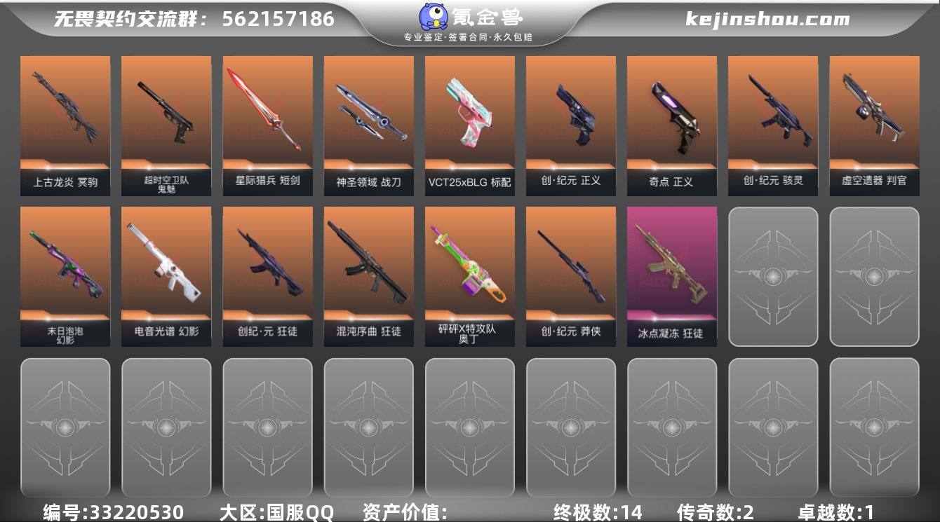 【套装】:创·纪元套装 【英雄】:幻棱,炼狱,维斯,暮蝶,钛狐,壹决,捷风,雷兹,幽影,不死鸟,贤者,猎枭,零,芮娜,奇乐,尚勃勒,霓虹,斯凯,夜露,星礈,K/O,海神,盖可,黑梦,钢锁 【近战武器】:近战武器-镭切,近战武器-神圣领域 战刀,近战武器-星际猎兵 短剑 【狂徒】:狂徒-混沌序曲,狂徒-创·纪元,狂徒-冰点凝冻 【幻影】:幻影-电音光谱,幻影-末日泡泡,幻影-神圣领域,幻影-电音光谱 【戍卫】:戍卫-月球哨兵 【獠犬】:獠犬-神圣领域 【冥驹】:冥驹-上古龙炎,冥驹-星云暗涌 【莽侠】:莽侠-创·纪元,莽侠-月球哨兵 【战神】:战神-神圣领域 【奥丁】:奥丁-砰砰X特攻队 【判官】:判官-虚空遗器 【雄鹿】:雄鹿-月球哨兵 【骇灵】:骇灵-创·纪元,骇灵-无限竞技,骇灵-星云暗涌 【蜂刺】:蜂刺-星云暗涌 【VCT手枪】:标配-VCT25 x BLG 【正义】:正义-奇点,正义-创·纪元,正义-月球哨兵 【鬼魅】:鬼魅-超时空卫队,鬼魅-诡秘蛇影,鬼魅-星云暗涌 【狂怒】:狂怒-神圣领域 【卡面】:树懒大作战 卡面,战术小伙伴的夏日 卡面,梦幻奶茶 卡面,源能反应 卡面,零点嗅探设计图 卡面,无畏契约GO!第一卷:芮娜 卡面,清除名单 卡面,无畏契约GO!...