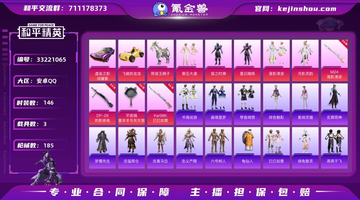 【kyhp467】安卓 手Q-5粉装-4特效枪-3载具-2粉色飞行器-54516热力值-3王牌印记-146套装-185枪皮 【热门品类】:角色-忠猛周仓,角色-忠真马岱,角色-忠义严颜,套装-六号树人,套装-龟仙人,大砍刀-青龙偃月刀,撬棍-龙胆亮银枪 【粉色套装】:粉装-第五大道,角色-宙之时溯,角色-星云暗核,粉装-莲影清波,角色-月影灵韵 【粉色枪皮等级】:Kar98K-巳巳如意(五级),M24-莲影清波(六级),DP-28-豹影疾电(五级),平底锅-喜羊羊与灰太狼(五级) 【粉色载具】:虚妄之影(炫耀紫),飞驰奶龙龙,照夜玉狮子 【粉色枪皮】:Kar98K-巳巳如意,M24-莲影清波,DP-28-豹影疾电,平底锅-喜羊羊与灰太狼 【粉色飞行器】:炫彩糖果飞行器,万古烈焰飞行器 【粉色降落伞】:至尊龙雀降落伞,闲梦青缨降落伞,超新星降落伞,万古烈焰降落伞,莲影清波降落伞,龙行天下降落伞,彩装战姬降落伞,萌酷奶龙降落伞,月影灵韵降落伞,智耀战神降落伞,幻彩电音降落伞,冷漠罗丽降落伞,异瞳寒姬降落伞,天象三御降落伞,炫彩糖果降落伞 【稀有套装】:套装-龟仙人,套装-巳巳如意,套装-雪国风尚,套装-炫彩糖果,角色-俏兔智灵,套装-燕燕于飞,套装-鱼渊荷华,套装-闪电轻猫,套装-紫幽梦,套装...