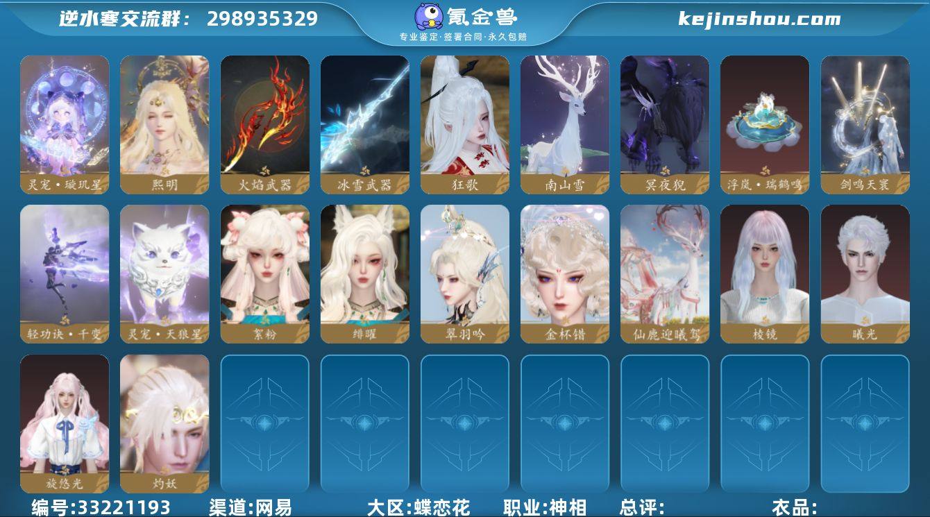 【已用天赏石49-转盘外观4】战力值:2168902 总评:2168902 角色等级:89 衣品值: 351505 国色值: 165560 已用天赏石:49 天霓染数量:12 【网易手机账号】 【无换绑冷却】 【神相】 【女】 【8级】 【卧看千山】 【互通】 转盘外观4 副本外观5 天赏外观14 天赏祥瑞3 天赏灵宠2 武器环身3 转盘外观:棱镜,曦光,旋悠光,灼妖; 副本外观:白夜拂雪,紫宿宸极,霜途无间,星落月皓,飞焰流波; 天赏外观:金杯错,熙明,绯曜,狂歌,絮粉,翠羽吟,浮岚·瑞鹤鸣,冰雪武器,雷霆武器,火焰武器,水武器,轻功诀千变,妖影寻灵·狐舞青丘,绝技剑鸣天寰; 天赏祥瑞:仙鹿迎曦驾,冥夜猊,南山雪; 天赏灵宠:灵宠·璇玑星,灵宠·天狼星; 武器环身:灵息环流,浑天四相,照罪赦渊;
