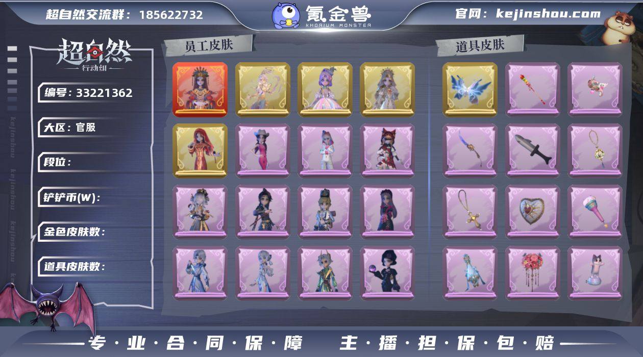 红皮1;金皮4;紫皮14;道具皮39;皮肤:巫铃儿-镜生遗梦,小黄-遗失的童话,薇薇安-圣光之谕,巫铃儿-镜花辞,逍遥-莲华渡,艾伦-绒绒对决,爱丽丝-耀眼的你,逍遥-泽引山海,巫铃儿-素影瑶光,零-青云逸歌,逍遥-绣春逍影,艾伦-水王子,莉莉-情公主,阿念-王子与骑士,爱丽丝-丝缕哀歌,莉莉-莓果陷阱,莉莉-除妖小师妹,小黄-,薇薇安-黑月挽歌;道具:喷气背包-晶澜灵翼,额外的背包-飞花令,长枪-糖葫芦霸王枪,摸金符-祝祷词,刺刀-紫气东来,电击枪-甜蜜泡泡枪,刺刀-小鲨匕首,摸金符-紫霄,黄牛能量饮料-青玉抱丹,音响-happy猫,专业手电-云端梦想计划,腰包-宝剑八,摸金符-花落精绝,葫芦-伏妖塔,除颤仪-弦外之音,夜视仪-金丝眼镜,传送按钮-昆仑镜,喷气背包-乘风溯雪,音响-鸣沙鼓,转轮手枪-新星时代,黄牛能量饮料-珍珠芭乐莓莓,刺刀-碧络琅环,急救包-蔷薇物语,腰包-月下莲台,桃木剑-永眠曲,短管猎枪-星光的裁决,传送按钮-浮生一梦,铲子-龙鳞,腰包-惊魂娃娃,传送按钮-幻宠之门,夜视仪-心跳眼镜,长枪-罪棘,长鞭-飞天绫,桃木剑-最后的独角兽,铲子-卡皮巴拉小黄豚铲,桃木剑-凤鸣九天,短管猎枪-赞萌露比水枪,长鞭-小狗蛇点点鞭,铲子-圣心之泪;美妆:美妆-暗夜小恶魔;饰品:头饰-精致露比头套,头饰-...
