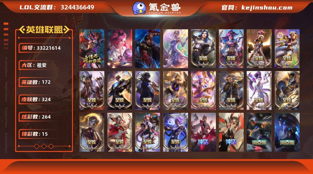 白银段位-172英雄-324皮肤-264炫彩-6终极-27神话-46限定-52传说-36史诗 【神话皮肤】:殿堂传奇乐芙兰,十五周年纪念希维尔,水晶圣骑艾希,神凰行者瑞羽圣凰艾尼维亚,黎明使者卡尔玛 【至臻皮肤】:至臻魅惑女巫厄运小姐,至臻电玩女神凯特琳,至臻双城之战2指挥官凯特琳,至臻焰执事布兰德,至臻飞升战神潘森,至臻灵能特工伊泽瑞尔,至臻KDA阿卡丽,至臻战斗学院蕾欧娜,至臻幻灵狮心蕾欧娜,至臻太空律动节奏幻师璐璐,至臻永恒星灵佐伊,至臻KDAALLOUT卡莎,至臻幻灵战斗猫金克丝,至臻真实伤害赛娜,至臻月蚀骑士赛娜,至臻未来战士锤石,至臻神凰行者烈羽焰凰霞 【海克斯皮肤】:新创战纪希维尔,海克斯科技斯维因,摄魂使者薇恩,海克斯科技玛尔扎哈,海克斯科技克格莫 【臻彩皮肤】:无畏骑士瑟庄妮赤子初心,征服者韦鲁斯炫金,征服者阿利斯塔炫金,源计划毁灭派克幻灭,西部天使赛娜神选天使长,星之守护者金克丝黑洞,山海绘卷科加斯朱红,可爱可爱粉红红布里茨,殿堂传奇乐芙兰登神,魔女阿卡丽虚荣,净雪之月莫甘娜冬虹,幽梦玫瑰泰隆浪漫花蕾 【年限皮肤】:紫金罗刹莫甘娜,福牛守护者厄斐琉斯,天龙之子迦娜,天龙之子斯莫德 【情人节限定】:甜心宝贝娑娜...
