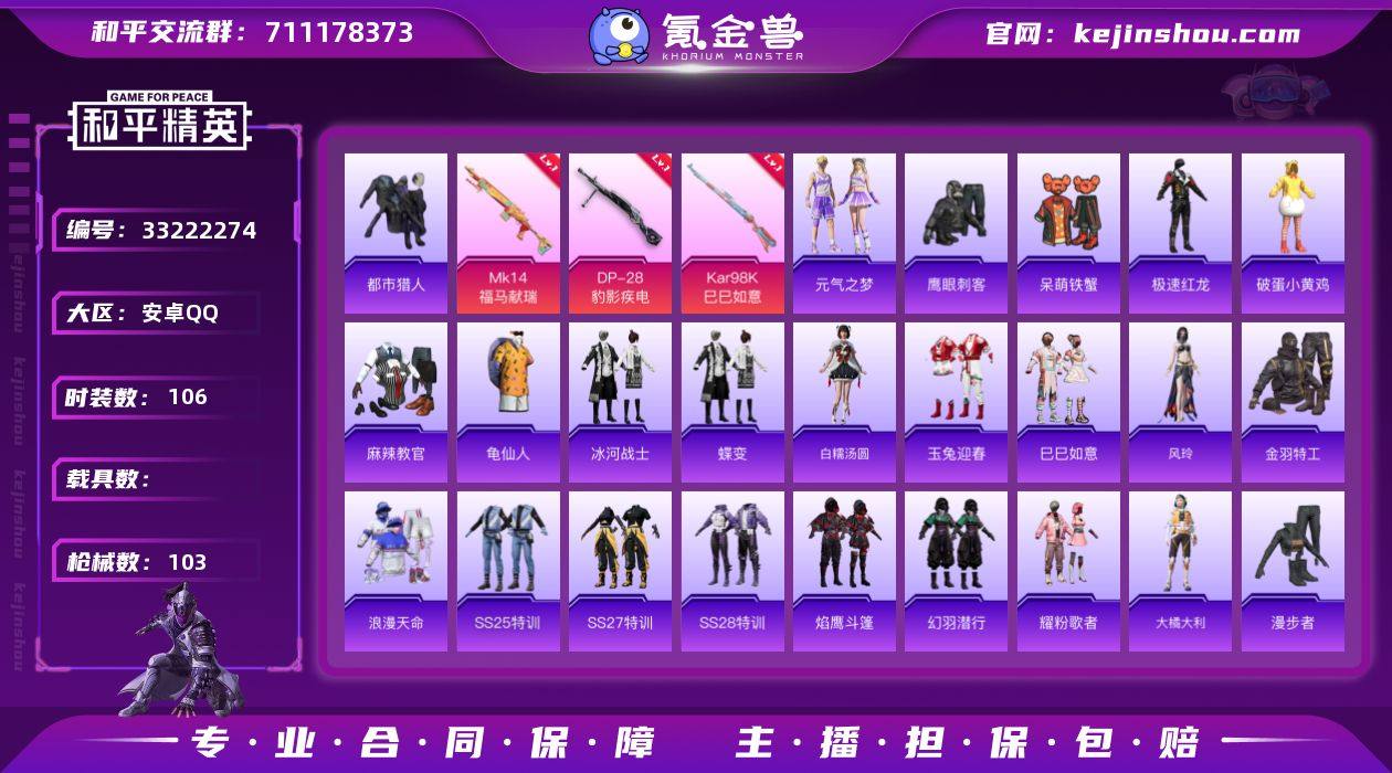 M1047548可二次【3特效枪都市猎人,浪漫天命】安卓手Q-3特效枪-106套装-103枪皮-3王牌印记-不朽星钻Ⅴ-29766热力值【3特效枪】Kar98K-巳巳如意[5级],Mk14-福马献瑞[5级],DP-28-豹影疾电[5级]【2稀有】都市猎人,浪漫天命【2飞行器】马上有福飞行器,光之冒险尾迹【204其它衣服和枪皮】幻世战舞者,巳巳如意,滨海假日,麻辣教官,战术大师,青翼流星,绯格组合,炫蓝之夏,SS27特训,薄荷星砂,福星高照,SS31特训,极速红龙,SS18特训,异彩先驱,幻影武者,角色-风玲,SS20特训,妙红点点,黄色伏地魔,马上有钱,元气之梦,黑色伏地魔,青年教官,青涩时光,SS21特训,SS22特训,人气偶像,光之冒险,SS32特训,大橘大利,龙魂突击队,霓虹街区,绮丽涂鸦,红釉青花,福马献瑞,飞行日记,SS25特训,萌黄之夏,SS36特训,燕雀桃枝,破晓战魂,元素星魂,王牌教练,SS33特训,海盐绵绵冰,旭日情侣,音速流光,黄色名流,SS37特训,鹰眼刺客,完美偶像,柠萌假日,雨过天青,都市魅力,蝶变,白糯汤圆,云魄琉璃,牛气冲天,深蓝色名流,破蛋小黄鸡,SS34特训,缤纷果语,老实芭蕉,呆萌铁蟹,红色运动,蓝彩潮人,SS19特训,竞技达人朋克,狙击之神,战地督导,湖蓝色名流,漫步者,疯狂小兔子,幻彩翩翩,潮流炫酷,蓝色运动,SS23特训,SS17特训,SS28特训,竞...