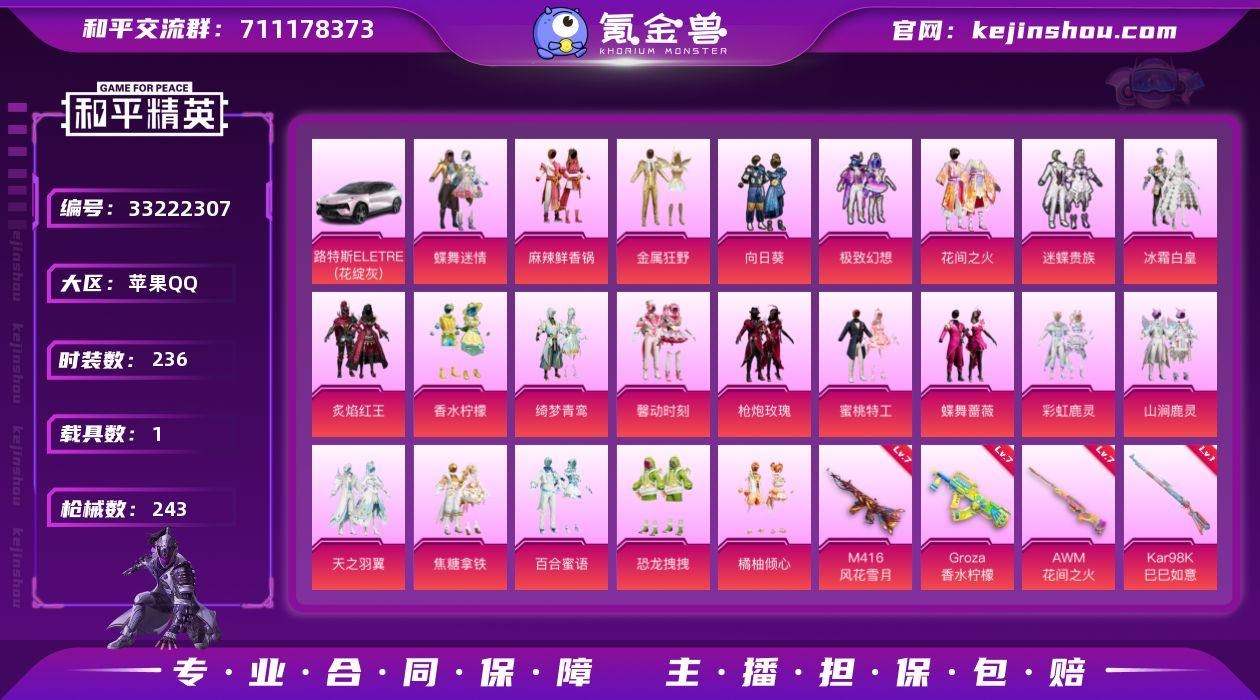 苹果 手Q-22粉装-4特效枪-1载具-2粉色飞行器-85011热力值-10王牌印记-236套装-243枪皮 【热门品类】:角色-军刀雅典娜,套装-金羽特工,套装-潮萌小黄鸭,套装-浪漫波比,套装-粉红小猪 【粉色套装】:粉装-蝶舞迷情,粉装-麻辣鲜香锅,粉装-金属狂野,粉装-向日葵,粉装-极致幻想,粉装-花间之火,粉装-迷蝶贵族,粉装-冰霜白皇,粉装-炙焰红王,粉装-香水柠檬,粉装-绮梦青鸾,粉装-馨动时刻,粉装-枪炮玫瑰,粉装-蜜桃特工,粉装-蝶舞蔷薇,粉装-彩虹鹿灵,粉装-山涧鹿灵,粉装-天之羽翼,粉装-焦糖拿铁,粉装-百合蜜语,粉装-恐龙拽拽,粉装-橘柚倾心 【粉色枪皮等级】:M416-风花雪月(七级),GROZA-香水柠檬(七级),Kar98K-巳巳如意(一级),AWM-花间之火(七级) 【粉色载具】:路特斯ELETRE(花绽灰) 【粉色枪皮】:M416-风花雪月,GROZA-香水柠檬,Kar98K-巳巳如意,AWM-花间之火 【粉色飞行器】:林间仙鹿飞行器,天之羽翼飞行器 【粉色降落伞】:粉色回忆降落伞,春暖花开降落伞,天启纪元降落伞,龙虾霸霸降落伞,PEL轰鸣竞梦者降落伞,神秘黑猫降落伞,古堡领主降落伞,繁花小夜曲降落伞,甜蜜誓约降落伞,马卡龙降落伞,香水柠檬降落伞,枪炮玫瑰降落伞,林间仙鹿...