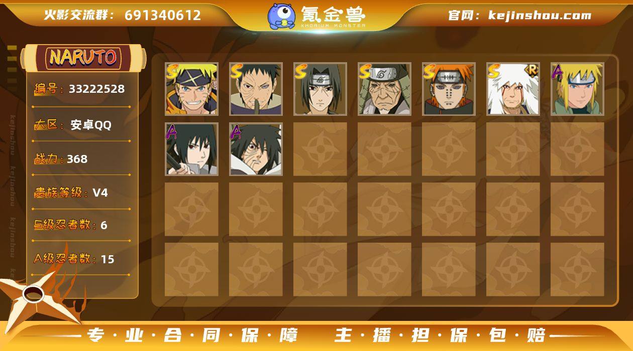 HY22090|【可实名】可二次 368w战力 v4 安卓QQ 772区 S忍者数:6 A忍者数:15 时装6安卓QQ 772区 S忍者数:6 A忍者数:15 忍者:漩涡鸣人·宇智波佐助,宇智波带土「忍界大战」,自来也「舞之豪杰」,猿飞日斩「秽土转生」,宇智波鼬「须佐能乎」,佩恩「天道」,小南「神驹佑将」,迈特凯「青春爆炸」,巳月「仙人模式」,宇智波泉奈,日向雏田「最终章」,波风水门「青年」,宇智波佐助「须佐能乎」,宇智波带土「暴怒」,药师兜「半蛇斗篷」,大蛇丸「晓」,春野樱「百豪」,飞段,迪达拉,干柿鬼鲛,迈特凯,二位由木人「奇拉比落风传」,佩恩「畜生道」,佩恩「地狱道」,野原琳「漂泊浪客」,佐井「最终章」,御手洗红豆「新春限定」,鬼灯满月「忍刀七人众」,奈良鹿丸「忍界大战」,春野樱「忍者少女」,鬼灯水月「鹰」,佩恩「畜生道」,惠比寿,木叶丸「疾风传」,重吾,天天「疾风传」,宇智波鼬「暗部」,旗木卡卡西「暗部」,山中井野「疾风传」,勘九郎「疾风传」,大和,春野樱「疾风传」,漩涡鸣人「疾风传」,君麻吕,宇智波斑「少年」,笕堇,丸星古介,结乃岩部,并足雷同,山城青叶,鬼童丸「秽土转生」,麻布伊,水木「咒印」,金槌,萨克镫,春野樱「忍者新秀」,漩涡鸣人「忍者学员」,月光疾风,日向花火,手鞠「镰多利...