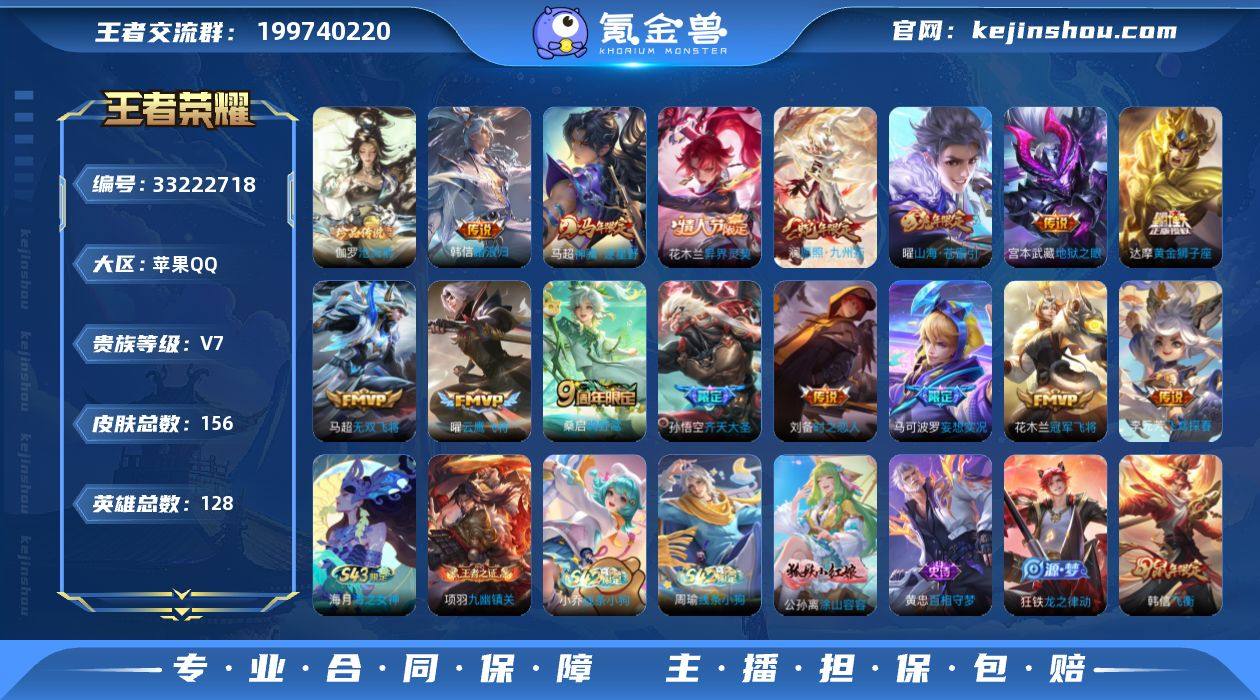 【mwz385】苹果Q-V7-最强王者段位-128英雄-156皮肤-1珍品传说-15传说-39史诗 【英雄全皮】:孙权全皮,敖隐全皮 【珍品传说】:伽罗沧流箭 【传说皮肤】:韩信踏浪归,马超神骥逐星野,花木兰异界灵契,澜愿照九州拓,桑启鸣野蒿,马可波罗妄想实况,孙悟空齐天大圣,曜山海苍雷引,马超无双飞将,李元芳飞鸢探春,曜云鹰飞将,刘备时之恋人,达摩黄金狮子座,花木兰冠军飞将,宫本武藏地狱之眼 【限定皮肤】:姜子牙天穹之誓,狄仁杰阴阳师,赵云皇家上将,马可波罗妄想实况,狄仁杰魔术师,项羽海滩派对,韩信飞衡,孙悟空齐天大圣,李元芳云中旅人,裴擒虎擒涛扼浪,嫦娥暖冬兔眠,曜山海苍雷引,西施玲珑珍味,鲁班大师探海日志,桑启海盐诗旅,暃星界游侠,艾琳女武神,张良古海寻踪,鬼谷子天穹祈灯,刘邦剑破天穹,周瑜熔金海岸 【年限皮肤】:韩信飞衡,曜山海苍雷引,澜愿照九州拓 【赛季限定】:李元芳云中旅人,桑启海盐诗旅,裴擒虎擒涛扼浪,鲁班大师探海日志,张良古海寻踪,鬼谷子天穹祈灯,刘邦剑破天穹,姜子牙天穹之誓,东皇太一噬灭天穹,太乙真人谧流熔炉,甄姬逆浪荇歌,亚瑟荣光之誓,项羽九幽镇关 【战令限定】:暃星界游侠,嫦娥暖冬兔眠,西施玲珑珍...
