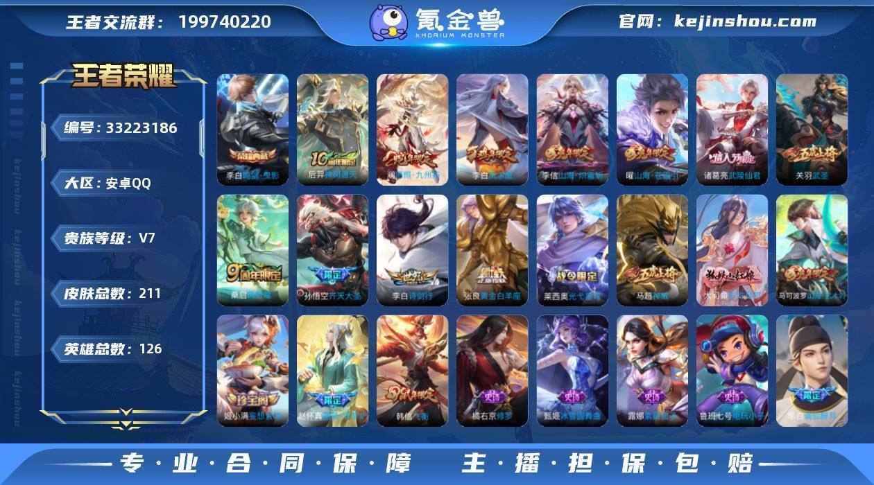 安卓Q-V7-最强王者段位-126英雄-211皮肤-1典藏皮肤-11传说-54史诗 【英雄全皮】:影全皮 【荣耀典藏】:李白鸣剑曳影 【传说皮肤】:后羿神树通天,澜愿照九州拓,桑启鸣野蒿,孙悟空齐天大圣,曜山海苍雷引,李信山海炽霜斩,李白诗剑行,关羽武圣,张良黄金白羊座,诸葛亮武陵仙君,李白凤求凰 【限定皮肤】:姜子牙天穹之誓,李白谪仙醉月,狄仁杰阴阳师,赵云皇家上将,嬴政优雅恋人,庄周高山流水,高渐离死亡摇滚,扁鹊奇幻香踪,周瑜赤莲之焰,夏侯惇朔风刀,甄姬游园惊梦,曹操天狼征服者,马可波罗山海玄木吟,狄仁杰魔术师,狄仁杰万华元夜,达摩沙漠行僧,项羽海滩派对,老夫子醍醐杖,关羽武圣,程咬金演武夺筹,韩信飞衡,兰陵王驯魔猎人,兰陵王金庭之子,孙悟空齐天大圣,牛魔御旌,李元芳云中旅人,钟馗驱傩正仪,杨戬潮玩骑兵,蔡文姬繁星吟游,鬼谷子原初探秘者,诸葛亮武陵仙君,苏烈千军破阵,弈星混沌棋,沈梦溪大漠名商,明世隐疑决卦,裴擒虎李小龙,裴擒虎擒涛扼浪,云中君纤云弄巧,李信山海炽霜斩,盾山御銮,上官婉儿神器万象笔,嫦娥暖冬兔眠,曜山海苍雷引,鲁班大师探海日志,桑启海盐诗旅,暃星界游侠,艾琳流音漫舞,阿古朵江河有灵,张良古...