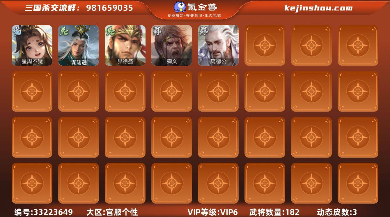【32】官阶:中军将军;VIP等级:VIP6;史诗武将数量:6;动态皮肤数量:3;武将总数:182;史诗宝珠数量:0;将魂数量:5600;神将:1;魏国史诗武将:4;蜀国史诗武将:47;吴国史诗武将:41;群史诗武将:40